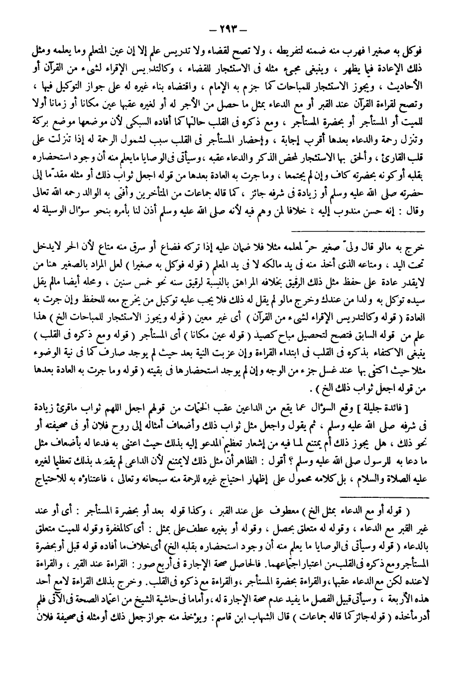 [فَائِدَةٌ جَلِيلَةٌ] وَقَعَ السُّؤَالُ عَمَّا يَقَعُ مِنْ الدَّاعِينَ عَقِبَ الْخَتَمَاتِ مِنْ قَوْلِهِمْ اجْعَلْ اللَّهُمَّ ثَوَابَ مَا قُرِئَ زِيَادَةً فِي شَرَفِهِ - صَلَّى اللَّهُ عَلَيْهِ وَسَلَّمَ -، ثُمَّ يَقُولُ وَاجْعَلْ مِثْلَ ثَوَابِ ذَلِكَ وَأَضْعَافَ أَمْثَالِهِ إلَى رُوحِ فُلَانٍ أَوْ فِي صَحِيفَتِهِ أَوْ نَحْوِ ذَلِكَ، هَلْ يَجُوزُ ذَلِكَ أَمْ يُمْتَنَعُ لِمَا فِيهِ مِنْ إشْعَارِ تَعْظِيمِ الْمَدْعُوِّ إلَيْهِ بِذَلِكَ حَيْثُ اعْتَنَى بِهِ فَدَعَا لَهُ بِأَضْعَافِ مِثْلِ مَا دَعَا بِهِ لِلرَّسُولِ - صَلَّى اللَّهُ عَلَيْهِ وَسَلَّمَ -؟ أَقُولُ: الظَّاهِرُ أَنَّ مِثْلَ ذَلِكَ لَا يَمْتَنِعُ لِأَنَّ الدَّاعِيَ لَمْ يَقْصِدْ بِذَلِكَ تَعْظِيمًا لِغَيْرِهِ - عَلَيْهِ الصَّلَاةُ وَالسَّلَامُ -، بَلْ كَلَامُهُ مَحْمُولٌ عَلَى إظْهَارِ احْتِيَاجِ غَيْرِهِ لِلرَّحْمَةِ مِنْهُ سُبْحَانَهُ وَتَعَالَى، فَاعْتِنَاؤُهُ بِهِ لِلِاحْتِيَاجِ