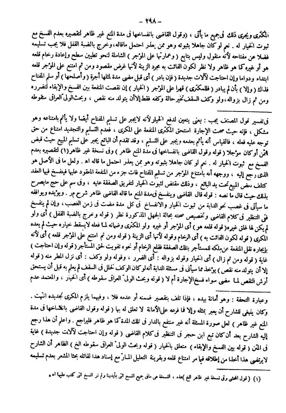 ـــــــــــــــــــــــــــــSفِي تَفْسِيرِ قَوْلِ الْمُصَنِّفِ يَجِبُ: يَعْنِي يَتَعَيَّنُ لِدَفْعِ الْخِيَارِ لِأَنَّهُ لَا يُجْبَرُ عَلَى تَسْلِيمِ الْمِفْتَاحِ أَيْضًا وَلَا يَأْثَمُ بِامْتِنَاعِهِ وَهُوَ مُشْكِلٌ، فَإِنَّهُ حَيْثُ صَحَّتْ الْإِجَارَةُ اسْتَحَقَّ الْمُكْتَرِي الْمَنْفَعَةَ عَلَى الْمُكْرِي، فَعَدَمُ التَّسْلِيمِ وَالتَّجْدِيدِ امْتِنَاعٌ مِنْ حَقٍّ تَوَجَّهَ عَلَيْهِ فِعْلُهُ، فَالْقِيَاسُ أَنَّهُ يَأْثَمُ بِعَدَمِهِ وَيُجْبَرُ عَلَى التَّسْلِيمِ، وَقَدْ تَقَدَّمَ أَنَّ الْبَائِعَ يُجْبَرُ عَلَى تَسْلِيمِ الْمَبِيعِ حَيْثُ قَبَضَ الثَّمَنَ أَوْ كَانَ مُؤَجَّلًا (قَوْلُهُ: وَقَوْلُ الْقَاضِي بِانْفِسَاخِهَا فِي مُدَّةِ الْمَنْعِ ظَاهِرٌ) وَفِي نُسْخَةٍ غَيْرُ ظَاهِرٍ لِتَقْصِيرِهِ بِعَدَمِ الْفَسْخِ مَعَ ثُبُوتِ الْخِيَارِ لَهُ. نَعَمْ لَوْ كَانَ جَاهِلًا بِثُبُوتِهِ وَهُوَ مِمَّنْ يُعْذَرُ احْتَمَلَ مَا قَالَهُ اهـ.