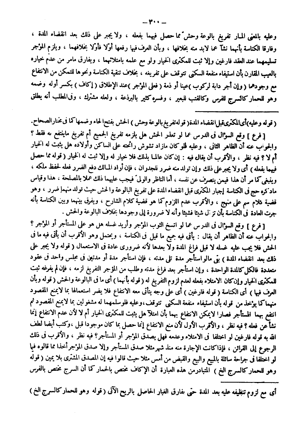 [فَرْعٌ] وَقَعَ السُّؤَالُ فِي الدَّرْسِ عَمَّا لَوْ اتَّسَخَ الثَّوْبُ الْمُؤَجَّرُ وَأُرِيدَ غَسْلُهُ هَلْ هُوَ عَلَى الْمُسْتَأْجِرِ أَوْ الْمُؤَجِّرِ؟ وَالْجَوَابُ عَنْهُ أَنَّ الظَّاهِرَ أَنْ يُقَالَ: يَأْتِي فِيهِ جَمِيعُ مَا قِيلَ فِي الْكُنَاسَةِ، وَيُحْتَمَلُ وَهُوَ الْأَقْرَبُ أَنْ يَأْتِيَ فِيهِ مَا فِي الْحَشِّ فَلَا يَجِبُ عَلَيْهِ غَسْلُهُ لَا قَبْلَ فَرَاغِ الْمُدَّةِ وَلَا بَعْدَهَا لِأَنَّهُ ضَرُورِيٌّ عَادَةً فِي الِاسْتِعْمَالِ (قَوْلُهُ: وَلَا يُجْبَرُ عَلَى ذَلِكَ بَعْدَ انْقِضَاءِ الْمُدَّةِ) بَقِيَ مَا لَوْ اسْتَأْجَرَ مُدَّةً تَلِي مُدَّتَهُ، فَإِنْ اسْتَأْجَرَ مُدَّةً أَوْ مُدَّتَيْنِ فِي مَجْلِسٍ وَاحِدٍ فِي عُقُودٍ مُتَعَدِّدَةٍ فَالْكُلُّ كَالْمُدَّةِ الْوَاحِدَةِ، وَإِنْ اسْتَأْجَرَ بَعْدَ فَرَاغِ مُدَّتِهِ وَطَلَبَ مِنْ الْمُؤَجِّرِ التَّفْرِيغَ لَزِمَهُ، فَإِنْ لَمْ يُفَرِّغْهُ ثَبَتَ لِلْمُكْتَرِي الْخِيَارُ وَإِنْ كَانَ الِامْتِلَاءُ بِفِعْلِهِ لِعَدَمِ لُزُومِ التَّفْرِيغِ لَهُ (قَوْلُهُ: بِأَنَّهُمَا) أَيْ مَا فِي الْبَالُوعَةِ وَالْحَشِّ (قَوْلُهُ: وَبِأَنَّ الْعُرْفَ فِيهَا) أَيْ الْكُنَاسَةِ (قَوْلُهُ فَارِغَيْنِ) أَيْ عَلَى وَجْهٍ يَتَأَتَّى مَعَهُ الِانْتِفَاعُ فَلَا يَضُرُّ اسْتِعْمَالُهَا بِمَا لَا يَمْنَعُ الْمَقْصُودَ مِنْهُمَا كَمَا يُؤْخَذُ مِنْ قَوْلِهِ بِأَنَّ اسْتِيفَاءَ مَنْفَعَةِ السُّكْنَى تَتَوَقَّفُ، وَعَلَيْهِ فَلَوْ سَلَّمَهُمَا لَهُ مَشْغُولَيْنِ بِمَا لَا يَمْنَعُ الْمَقْصُودَ ثُمَّ انْتَفَعَ بِهِمَا الْمُسْتَأْجِرُ فَصَارَا لَا يُمْكِنُ الِانْتِفَاعُ بِهِمَا بِأَنْ امْتَلَآ هَلْ يَثْبُتُ لِلْمُكْتَرِي الْخِيَارُ أَمْ لَا لِأَنَّ عَدَمَ الِانْتِفَاعِ إنَّمَا نَشَأَ عَنْ فِعْلِهِ؟ فِيهِ نَظَرٌ، وَالْأَقْرَبُ الْأَوَّلُ لِأَنَّ مَنْعَ الِانْتِفَاعِ إنَّمَا حَصَلَ بِمَا كَانَ مَوْجُودًا قَبْلُ، وَكَتَبَ أَيْضًا لَطَفَ اللَّهُ بِهِ قَوْلُهُ فَارِغَيْنِ لَوْ اخْتَلَفَا فِي الِامْتِلَاءِ وَعَدَمِهِ فَهَلْ يُصَدَّقُ الْمُؤَجِّرُ أَوْ الْمُسْتَأْجِرُ؟ فِيهِ نَظَرٌ، وَالْأَقْرَبُ فِي ذَلِكَ الرُّجُوعُ إلَى الْقَرَائِنِ، فَإِذَا كَانَتْ الْإِجَارَةُ مِنْهُ مُنْذُ شَهْرٍ مَثَلًا صُدِّقَ الْمُسْتَأْجِرُ وَإِلَّا صُدِّقَ الْمُؤَجِّرُ أَخْذًا مِمَّا قَالُوهُ فِيمَا لَوْ اخْتَلَفَا فِي جِرَاحَةٍ سَائِلَةٍ بِالْمَبِيعِ وَالْبَيْعُ وَالْقَبْضُ مِنْ أَمْسِ مَثَلًا حَيْثُ قَالُوا فِيهِ إنَّ الْمُصَدَّقَ الْمُشْتَرِي بِلَا يَمِينٍ.