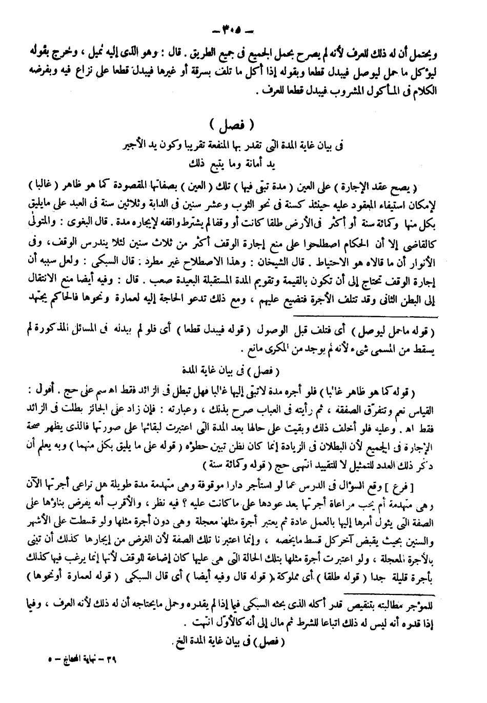 (فَصْلٌ) فِي بَيَانِ غَايَةِ الْمُدَّةِ الَّتِي تُقَدَّرُ بِهَا الْمَنْفَعَةُ تَقْرِيبًا وَكَوْنُ يَدِ الْأَجِيرِ يَدَ أَمَانَةٍ وَمَا يَتْبَعُ ذَلِكَ (يَصِحُّ عَقْدُ الْإِجَارَةِ) عَلَى الْعَيْنِ (مُدَّةً تَبْقَى فِيهَا) تِلْكَ (الْعَيْنُ) بِصِفَاتِهَا الْمَقْصُودَةِ كَمَا هُوَ ظَاهِرٌ (غَالِبًا) لِإِمْكَانِ اسْتِيفَاءِ الْمَعْقُودِ عَلَيْهِ حِينَئِذٍ كَسَنَةٍ فِي نَحْوِ الثَّوْبِ وَعَشْرِ سِنِينَ فِي الدَّابَّةِ وَثَلَاثِينَ سَنَةً فِي الْعَبْدِ عَلَى مَا يَلِيقُ بِكُلٍّ مِنْهَا وَكَمِائَةِ سَنَةٍ أَوْ أَكْثَرَ فِي الْأَرْضِ طَلْقًا كَانَتْ أَوْ وَقْفًا لَمْ يَشْتَرِطْ وَاقِفُهُ لِإِيجَارِهِ مُدَّةً. قَالَ الْبَغَوِيّ: وَالْمُتَوَلِّي كَالْقَاضِي إلَّا أَنَّ الْحُكَّامَ اصْطَلَحُوا عَلَى مَنْعِ إجَارَةِ الْوَقْفِ أَكْثَرَ مِنْ ثَلَاثِ سِنِينَ لِئَلَّا يَنْدَرِسَ الْوَقْفُ، وَفِي الْأَنْوَارِ أَنَّ مَا قَالَاهُ هُوَ الِاحْتِيَاطُ. قَالَ الشَّيْخَانِ: وَهَذَا الِاصْطِلَاحُ غَيْرُ مُطَّرِدٍ. قَالَ السُّبْكِيُّ: وَلَعَلَّ سَبَبَهُ أَنَّ إجَارَةَ الْوَقْفِ تَحْتَاجُ إلَى أَنْ تَكُونَ بِالْقِيمَةِ وَتَقْوِيمُ الْمُدَّةِ الْمُسْتَقْبَلَةِ الْبَعِيدَةِ صَعْبٌ. قَالَ: وَفِيهِ أَيْضًا مَنْعُ الِانْتِقَالِ إلَى الْبَطْنِ الثَّانِي وَقَدْ تَتْلَفُ الْأُجْرَةُ عَلَيْهِمْ، وَمَعَ ذَلِكَ تَدْعُو الْحَاجَةُ إلَيْهِ لِعِمَارَةٍ وَنَحْوِهَا فَالْحَاكِمُ يَجْتَهِدُ