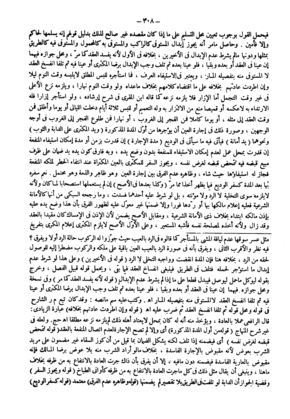 فَيُحْمَلُ الْقَوْلُ بِوُجُوبِ تَعْيِينِ مَحَلِّ التَّسْلِيمِ عَلَى مَا إذَا كَانَ مَقْصِدُهُ غَيْرَ صَالِحٍ لِذَلِكَ بِدَلِيلِ قَوْلِهِمْ إنَّهُ يُسَلِّمُهَا لِحَاكِمٍ وَإِلَّا فَأَمِينٍ. وَحَاصِلُ مَا مَرَّ أَنَّهُ يَجُوزُ إبْدَالُ الْمُسْتَوْفَى كَالرَّاكِبِ وَالْمُسْتَوْفَى بِهِ كَالْمَحْمُولِ وَالْمُسْتَوْفَى فِيهِ كَالطَّرِيقِ بِمِثْلِهَا وَدُونَهَا مَا لَمْ يُشْرَطْ عَدَمُ الْإِبْدَالِ فِي الْأَخِيرَيْنِ، بِخِلَافِهِ فِي الْأَوَّلِ لِأَنَّهُ يُفْسِدُ الْعَقْدَ كَمَا مَرَّ، وَمَحَلُّ جَوَازِهِ فِيهِمَا إنْ عُيِّنَا فِي الْعَقْدِ أَوْ بَعْدَهُ وَبَقِيَا، فَلَوْ عُيِّنَا بَعْدَهُ ثُمَّ تَلِفَ وَجَبَ الْإِبْدَالُ بِرِضَا الْمُكْتَرِي أَوْ عُيِّنَا فِيهِ ثُمَّ تَلِفَا انْفَسَخَ الْعَقْدُ لَا الْمُسْتَوْفَى مِنْهُ بِتَفْصِيلِهِ الْمَارِّ، وَيُعْتَبَرُ فِي الِاسْتِيفَاءِ الْعُرْفُ، فَمَا اسْتَأْجَرَهُ لِلُّبْسِ الْمُطْلَقِ لَا يَلْبَسُهُ وَقْتَ النَّوْمِ لَيْلًا وَإِنْ اطَّرَدَتْ عَادَتُهُمْ بِخِلَافِهِ عَلَى مَا اقْتَضَاهُ كَلَامُهُمْ بِخِلَافِ مَا عَدَاهُ وَلَوْ وَقْتَ النَّوْمِ نَهَارًا
