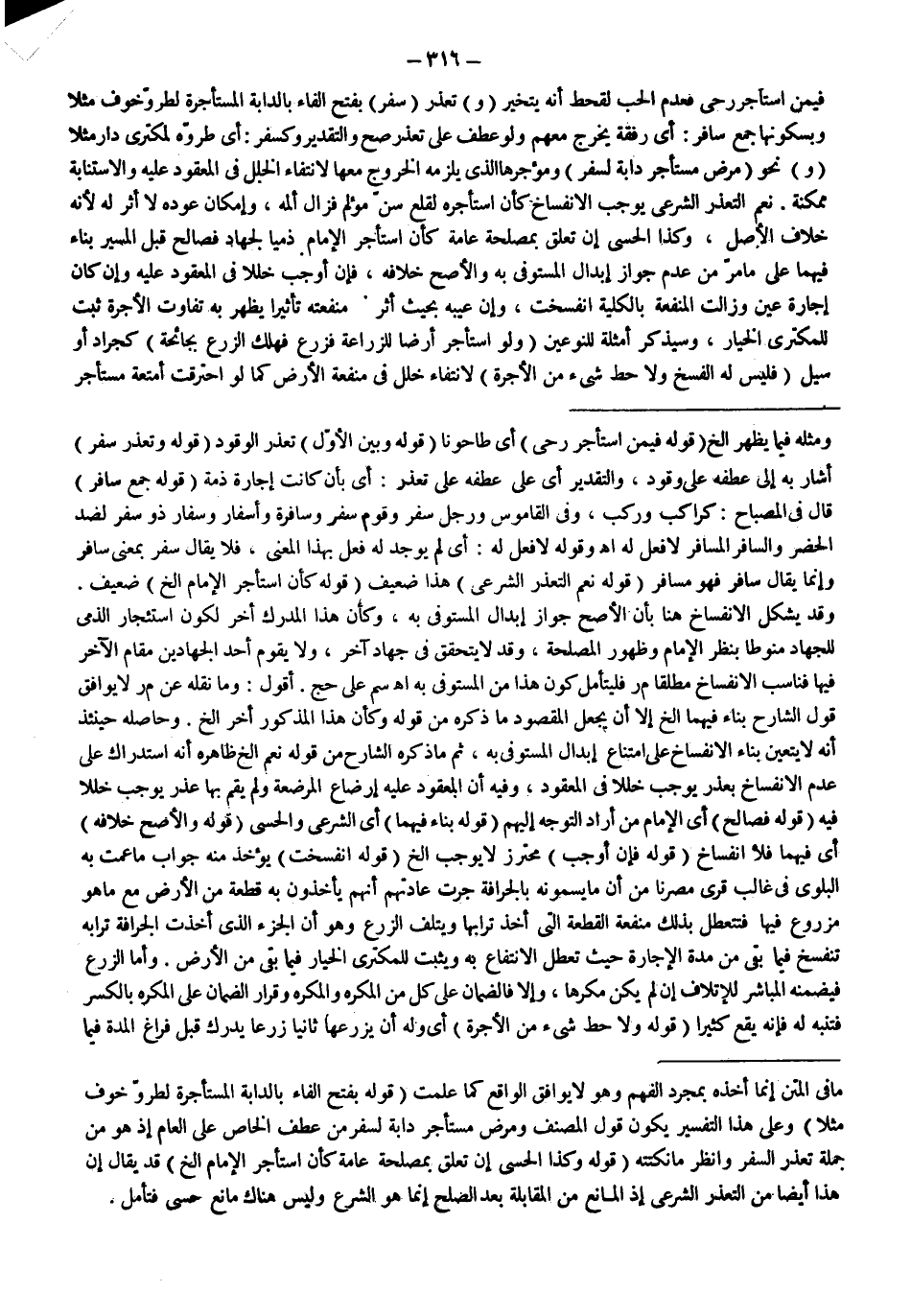 ـــــــــــــــــــــــــــــSوَمِثْلُهُ فِيمَا يَظْهَرُ إلَخْ (وَقَوْلُهُ فِيمَنْ اسْتَأْجَرَ رَحًى) أَيْ طَاحُونًا (قَوْلُهُ: وَبَيَّنَ الْأَوَّلَ) تَعَذَّرَ الْوَقُودُ (قَوْلُهُ: وَتَعَذَّرَ سَفَرٌ) أَشَارَ بِهِ إلَى عَطْفِهِ عَلَى وَقُودِ، وَالتَّقْدِيرُ أَيْ عَلَى عَطْفِهِ عَلَى تَعَذَّرَ: أَيْ بِأَنْ كَانَتْ إجَارَةَ ذِمَّةٍ (قَوْلُهُ: جَمْعُ سَافِرٍ) قَالَ فِي الْمِصْبَاحِ: كَرَاكِبٍ وَرَكْبٍ، وَفِي الْقَامُوسِ وَرَجُلٌ سَفْرٌ وَقَوْمٌ سَفْرٌ وَسَافِرَةٌ وَأَسْفَارٌ وَسُفَّارٌ ذَوُو سَفَرٍ لِضِدِّ الْحَضَرِ، وَالسَّافِرُ الْمُسَافِرُ لَا فِعْلَ لَهُ اهـ. وَقَوْلُهُ لَا فِعْلَ لَهُ: أَيْ لَمْ يُوجَدْ لَهُ فِعْلٌ بِهَذَا الْمَعْنَى، فَلَا يُقَالُ سَفَرَ بِمَعْنَى سَافَرَ وَإِنَّمَا يُقَالُ سَافَرَ فَهُوَ مُسَافِرٌ (قَوْلُهُ نَعَمْ التَّعَذُّرُ الشَّرْعِيُّ) هَذَا ضَعِيفٌ (قَوْلُهُ: كَأَنْ اسْتَأْجَرَ الْإِمَامُ إلَخْ) ضَعِيفٌ. وَقَدْ يُشْكَلُ الِانْفِسَاخُ هُنَا بِأَنَّ الْأَصَحَّ جَوَازُ إبْدَالِ الْمُسْتَوْفَى بِهِ، وَكَأَنَّ هَذَا الْمُدْرَكُ أُخِّرَ لِكَوْنِ اسْتِئْجَارِ الذِّمِّيِّ لِلْجِهَادِ مَنُوطًا بِنَظَرِ الْإِمَامِ وَظُهُورِ الْمَصْلَحَةِ، وَقَدْ لَا يَتَحَقَّقُ فِي جِهَادٍ آخَرَ، وَلَا يَقُومُ أَحَدُ الْجِهَادَيْنِ مَقَامَ الْآخَرِ فِيهَا فَنَاسَبَ الِانْفِسَاخَ مُطْلَقًا م ر فَلْيُتَأَمَّلْ كَوْنُ هَذَا مِنْ الْمُسْتَوْفَى بِهِ اهـ سم عَلَى حَجّ. أَقُولُ: وَمَا نَقَلَهُ عَنْ م ر لَا يُوَافِقُ قَوْلَ الشَّارِحِ بِنَاءً فِيهِمَا إلَخْ إلَّا أَنْ يُجْعَلَ الْمَقْصُودُ مَا ذَكَرَهُ مِنْ قَوْلِهِ وَكَأَنَّ هَذَا الْمَذْكُورَ أُخِّرَ إلَخْ. وَحَاصِلُهُ حِينَئِذٍ أَنَّهُ لَا يَتَعَيَّنُ بِنَاءُ الِانْفِسَاخِ عَلَى امْتِنَاعِ إبْدَالِ الْمُسْتَوْفَى بِهِ، ثُمَّ مَا ذَكَرَهُ الشَّارِحُ مِنْ قَوْلِهِ نَعَمْ إلَخْ ظَاهِرُهُ أَنَّهُ اسْتِدْرَاكٌ عَلَى عَدَمِ الِانْفِسَاخِ بِعُذْرٍ يُوجِبُ خَلَلًا فِي الْمَعْقُودِ، وَفِيهِ أَنَّ الْمَعْقُودَ عَلَيْهِ إرْضَاعُ الْمُرْضِعَةِ وَلَمْ يَقُمْ بِهَا عُذْرٌ يُوجِبُ خَلَلًا فِيهِ (قَوْلُهُ: فَصَالَحَ) أَيْ الْإِمَامُ مَنْ أَرَادَ التَّوَجُّهَ إلَيْهِمْ (قَوْلُهُ بِنَاءً فِيهِمَا) أَيْ الشَّرْعِيِّ وَالْحِسِّيِّ (قَوْلُهُ: وَالْأَصَحُّ خِلَافُهُ) أَيْ فِيهِمَا فَلَا انْفِسَاخَ (قَوْلُهُ فَإِنْ أَوْجَبَ) مُحْتَرَزٌ لَا يُوجِبُ إلَخْ (قَوْلُهُ انْفَسَخَتْ) يُؤْخَذُ مِنْهُ جَوَابُ مَا عَمَّتْ بِهِ الْبَلْوَى فِي غَالِبِ قُرَى مِصْرِنَا مِنْ أَنَّ مَا يُسَمُّونَهُ بِالْجَرَّافَةِ جَرَتْ عَادَتُهُمْ أَنَّهُمْ يَأْخُذُونَ بِهِ قِطْعَةً مِنْ الْأَرْضِ مَعَ مَا هُوَ مَزْرُوعٌ فِيهَا فَتَتَعَطَّلُ بِذَلِكَ مَنْفَعَةُ الْقِطْعَةِ الَّتِي أُخِذَ تُرَابُهَا وَيَتْلَفُ الزَّرْعُ وَهُوَ أَنَّ الْجُزْءَ الَّذِي أَخَذَتْ الْجَرَّافَةُ تُرَابَهُ تَنْفَسِخُ فِيمَا بَقِيَ مِنْ مُدَّةِ الْإِجَارَةِ حَيْثُ تَعَطَّلَ الِانْتِفَاعُ بِهِ وَيَثْبُتُ لِلْمُكْتَرِي الْخِيَارُ فِيمَا بَقِيَ مِنْ الْأَرْضِ. وَأَمَّا الزَّرْعُ فَيَضْمَنُهُ الْمُبَاشِرُ لِلْإِتْلَافِ إنْ لَمْ يَكُنْ مُكْرَهًا، وَإِلَّا فَالضَّمَانُ عَلَى كُلٍّ مِنْ الْمُكْرَهِ وَالْمُكْرِهِ وَقَرَارُ الضَّمَانِ عَلَى الْمُكْرِهِ بِالْكَسْرِ فَتَنَبَّهْ لَهُ فَإِنَّهُ يَقَعُ كَثِيرًا.