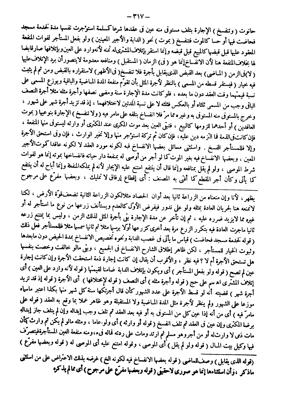 (وَلَا تَنْفَسِخُ) الْإِجَارَةُ بِنَوْعَيْهَا (بِمَوْتِ الْعَاقِدَيْنِ) أَوْ أَحَدِهِمَا لِلُزُومِهَا كَالْبَيْعِ، فَتَبْقَى الْعَيْنُ بَعْدَ مَوْتِ الْمُكْرِي عِنْدَ الْمُكْتَرِي أَوْ وَارِثِهِ لِيَسْتَوْفِيَ مِنْهَا الْمَنْفَعَةَ، فَإِنْ كَانَتْ فِي الذِّمَّةِ فَمَا الْتَزَمَهُ دَيْنٌ عَلَيْهِ، فَإِنْ كَانَ ثَمَّ تَرِكَةٌ اُسْتُؤْجِرَ مِنْهَا وَإِلَّا تَخَيَّرَ الْوَارِثُ، فَإِنْ وَفَّى اسْتَحَقَّ الْأُجْرَةَ وَإِلَّا فَلِلْمُسْتَأْجِرِ الْفَسْخُ. وَاسْتَثْنَى مَسَائِلَ بَعْضُهَا الِانْفِسَاخُ فِيهِ لِكَوْنِهِ مَوْرِدَ الْعَقْدِ لَا لِكَوْنِهِ عَاقِدًا كَمَوْتِ الْأَجِيرِ الْمُعَيَّنِ، وَبَعْضُهَا الِانْفِسَاخُ فِيهِ بِغَيْرِ الْمَوْتِ كَمَا لَوْ أَجَّرَ مَنْ أَوْصَى لَهُ بِمَنْفَعَةِ دَارٍ حَيَاتِهِ فَانْفِسَاخُهَا بِمَوْتِهِ إنَّمَا هُوَ لِفَوَاتِ شَرْطِ الْمُوصَى، وَلَوْ لَمْ يَقُلْ بِمَنَافِعِهِ وَإِنَّمَا قَالَ أَنْ يَنْتَفِعَ امْتَنَعَ عَلَيْهِ الْإِيجَارُ لِأَنَّهُ لَمْ يُمَلِّكْهُ الْمَنْفَعَةَ وَإِنَّمَا أَبَاحَ لَهُ أَنْ يَنْتَفِعَ كَمَا يَأْتِي وَكَأَنْ أَجَّرَ الْمَقْطَعَ كَمَا أَفْتَى بِهِ الْمُصَنِّفُ: أَيْ إقْطَاعَ إرْفَاقٍ لَا تَمْلِيكٍ، وَبَعْضُهَا مُفَرَّعٌ عَلَى مَرْجُوحٍ.