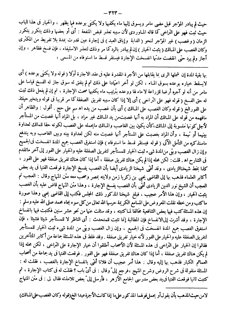 وَقَدْ غَلِطَ فِي هَذِهِ الْمَسْأَلَةِ جَمَاعَةٌ مِنْ أَكَابِرِ الْمُتَأَخِّرِينَ فَقَالُوا إنَّ الْخِيَارَ عَلَى التَّرَاخِي فِي هَذِهِ الْمَسْأَلَةِ لِأَنَّ الْأَصْحَابَ أَطْلَقُوا أَنَّ خِيَارَ الْإِجَارَةِ عَلَى التَّرَاخِي، لَكِنَّ مَحَلَّهُ إذَا لَمْ يَكُنْ هُنَاكَ تَفْرِيقُ صَفْقَةٍ، أَمَّا إذَا كَانَ هُنَاكَ تَفْرِيقُ صَفْقَةٍ فَهُوَ عَلَى الْفَوْرِ. فَوَقَعَتْ الْفُتْيَا فِي يَدِ جَمَاعَةٍ مِنْ أَصْحَابِ الْعَمَائِمِ الْكِبَارِ فَذَهَبَ بِهَا إلَيْهِ وَقَالَ: هَذَا أَمْرٌ عَجِيبٌ أَنَّ فُلَانًا أَفْتَى بِانْفِسَاخِ الْإِجَارَةِ بِالْغَصْبِ، فَقُلْت لَهُ: الْمَسْأَلَةُ مَنْقُولَةٌ فِي شَرْحِ الرَّوْضِ وَشَرْحِ الْمَنْهَجِ، فَرَجَعَ إلَيَّ وَقَالَ: فِي أَيِّ بَابٍ؟ فَقُلْت لَهُ فِي كِتَابِ الْإِجَارَةِ، ثُمَّ كَتَبْت ثَانِيًا فَوَقَعَتْ الْفُتْيَا فِي يَدِ بَعْضِ مُدَرِّسِي الْجَامِعِ الْأَزْهَرِ، فَأَرْسَلَ إلَيَّ بَعْضُ تَلَامِذَتِهِ فَقَالَ لِي: فِي مَتْنِ الْمِنْهَاجِ