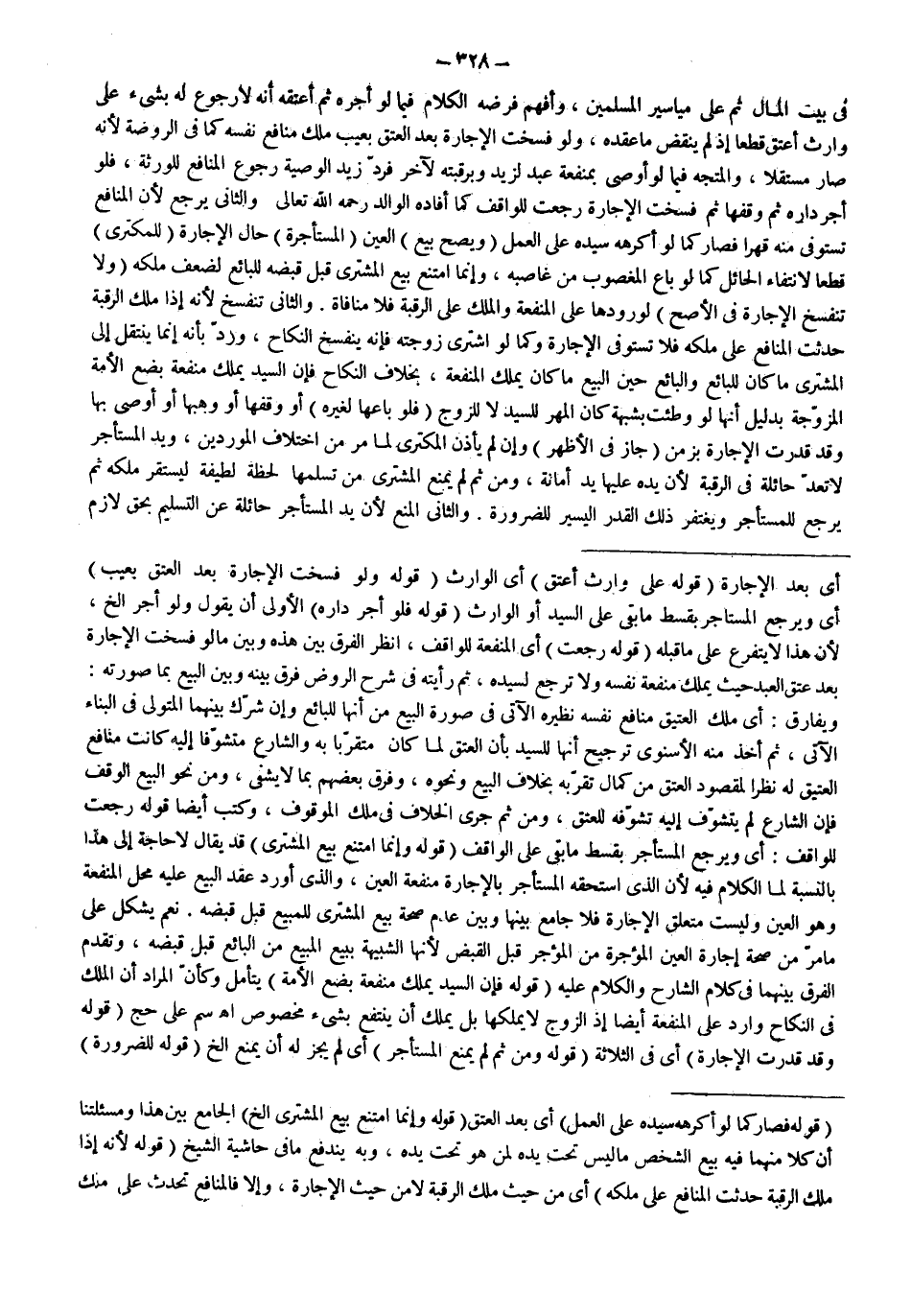 ـــــــــــــــــــــــــــــSأَيْ بَعْدَ الْإِجَارَةِ (قَوْلُهُ: عَلَى وَارِثٍ أُعْتِقَ) أَيْ الْوَارِثُ (قَوْلُهُ: وَلَوْ فُسِخَتْ الْإِجَارَةُ بَعْدَ الْعِتْقِ بِعَيْبٍ) أَيْ وَيَرْجِعُ الْمُسْتَأْجِرُ بِقِسْطِ مَا بَقِيَ عَلَى السَّيِّدِ أَوْ الْوَارِثِ (قَوْلُهُ: فَلَوْ أَجَّرَ دَارِهِ) الْأَوْلَى أَنْ يَقُولَ وَلَوْ أَجَّرَ إلَخْ، لِأَنَّ هَذَا لَا يَتَفَرَّعُ عَلَى مَا قَبْلَهُ (قَوْلُهُ: رَجَعَتْ) أَيْ الْمَنْفَعَةُ لِلْوَاقِفِ، اُنْظُرْ الْفَرْقَ بَيْنَ هَذِهِ وَبَيْنَ مَا لَوْ فُسِخَتْ الْإِجَارَةُ بَعْدَ عِتْقِ الْعَبْدِ حَيْثُ يَمْلِكُ مَنْفَعَةَ نَفْسِهِ وَلَا تَرْجِعُ لِسَيِّدِهِ، ثُمَّ رَأَيْته فِي شَرْحِ الرَّوْضِ فَرَّقَ بَيْنَهُ وَبَيْنَ الْبَيْعِ بِمَا صُورَتُهُ: وَيُفَارِقُ: أَيْ مِلْكُ الْعَتِيقِ مَنَافِعَ نَفْسِهِ نَظِيرَهُ الْآتِي فِي صُورَةِ الْبَيْعِ مِنْ أَنَّهَا لِلْبَائِعِ وَإِنْ شَرِكَ بَيْنَهُمَا الْمُتَوَلِّي فِي الْبِنَاءِ الْآتِي، ثُمَّ أَخَذَ مِنْهُ الْإِسْنَوِيُّ تَرْجِيحَ أَنَّهَا لِلسَّيِّدِ بِأَنَّ الْعِتْقَ لَمَّا كَانَ مُتَقَرَّبًا بِهِ وَالشَّارِعُ مُتَشَوِّفًا إلَيْهِ كَانَتْ مَنَافِعُ الْعَتِيقِ لَهُ نَظَرًا لِمَقْصُودِ الْعِتْقِ مِنْ كَمَالِ تَقَرُّبِهِ بِخِلَافِ الْبَيْعِ وَنَحْوِهِ، وَفَرَّقَ بَعْضُهُمْ بِمَا لَا يَشْفِي، وَمِنْ نَحْوِ الْبَيْعِ الْوَقْفُ فَإِنَّ الشَّارِعَ لَمْ يَتَشَوَّفْ إلَيْهِ تَشَوُّفَهُ لِلْعِتْقِ، وَمِنْ ثَمَّ جَرَى الْخِلَافُ فِي مِلْك الْمَوْقُوفِ، وَكَتَبَ أَيْضًا " قَوْلُهُ رَجَعْت لِلْوَاقِفِ " أَيْ وَيَرْجِعُ الْمُسْتَأْجِرُ بِقِسْطِ مَا بَقِيَ عَلَى الْوَاقِفِ.