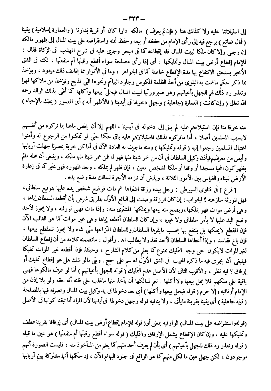 ـــــــــــــــــــــــــــــSعَنْهُ خَوْفًا مِنَّا فَإِنَّ اسْتِيلَاءَهُمْ عَلَيْهِ لَمْ يَبْقَ إلَى دُخُولِهِ فِي أَيْدِينَا، اللَّهُمَّ إلَّا أَنْ يُخَصَّ مَا هُنَا بِمَا تَرَكُوهُ مِنْ أَنْفُسِهِمْ لَا بِسَبَبِ الْمُسْلِمِينَ أَصْلًا، أَمَّا مَا تَرَكُوهُ لِذَلِكَ فَاسْتِيلَاؤُهُمْ عَلَيْهِ بَاقٍ حُكْمًا حَتَّى لَوْ تَمَكَّنُوا مِنْ الرُّجُوعِ لَهُ وَأَمِنُوا اغْتِيَالَ الْمُسْلِمِينَ رَجَعُوا إلَيْهِ (قَوْلُهُ: وَتَمْلِيكُهَا) وَمِنْهُ مَا جَرَتْ بِهِ الْعَادَةُ الْآنَ فِي أَمَاكِنَ خَرِبَةٍ بِمِصْرِنَا جُهِلَتْ أَرْبَابُهَا وَأُيِسَ مِنْ مَعْرِفَتِهِمْ فَيَأْذَنَ وَكِيلُ السُّلْطَانِ فِي أَنَّ مَنْ عَمَرَ شَيْئًا مِنْهَا فَهُوَ لَهُ فَمَنْ عَمَرَ شَيْئًا مِنْهَا مَلَكَهُ، وَيَنْبَغِي أَنَّ مَحِلَّهُ مَا لَمْ يَظْهَرْ كَوْنُ الْمُحَيَّا مَسْجِدًا أَوْ وَقْفًا أَوْ مِلْكًا لِشَخْصٍ مُعَيَّنٍ، فَإِنْ ظَهَرَ لَمْ يَمْلِكْهُ، وَبَعْدَ ظُهُورِهِ فَهُوَ مُخَيَّرٌ كَمَا فِي إعَارَةِ الْأَرْضِ لِلْبِنَاءِ وَالْغِرَاسِ بَيْنَ الْأُمُورِ الثَّلَاثَةِ، وَيَنْبَغِي أَنْ تَلْزَمَهُ الْأُجْرَةُ لِلْمَالِكِ مُدَّةَ وَضْعِ يَدِهِ.