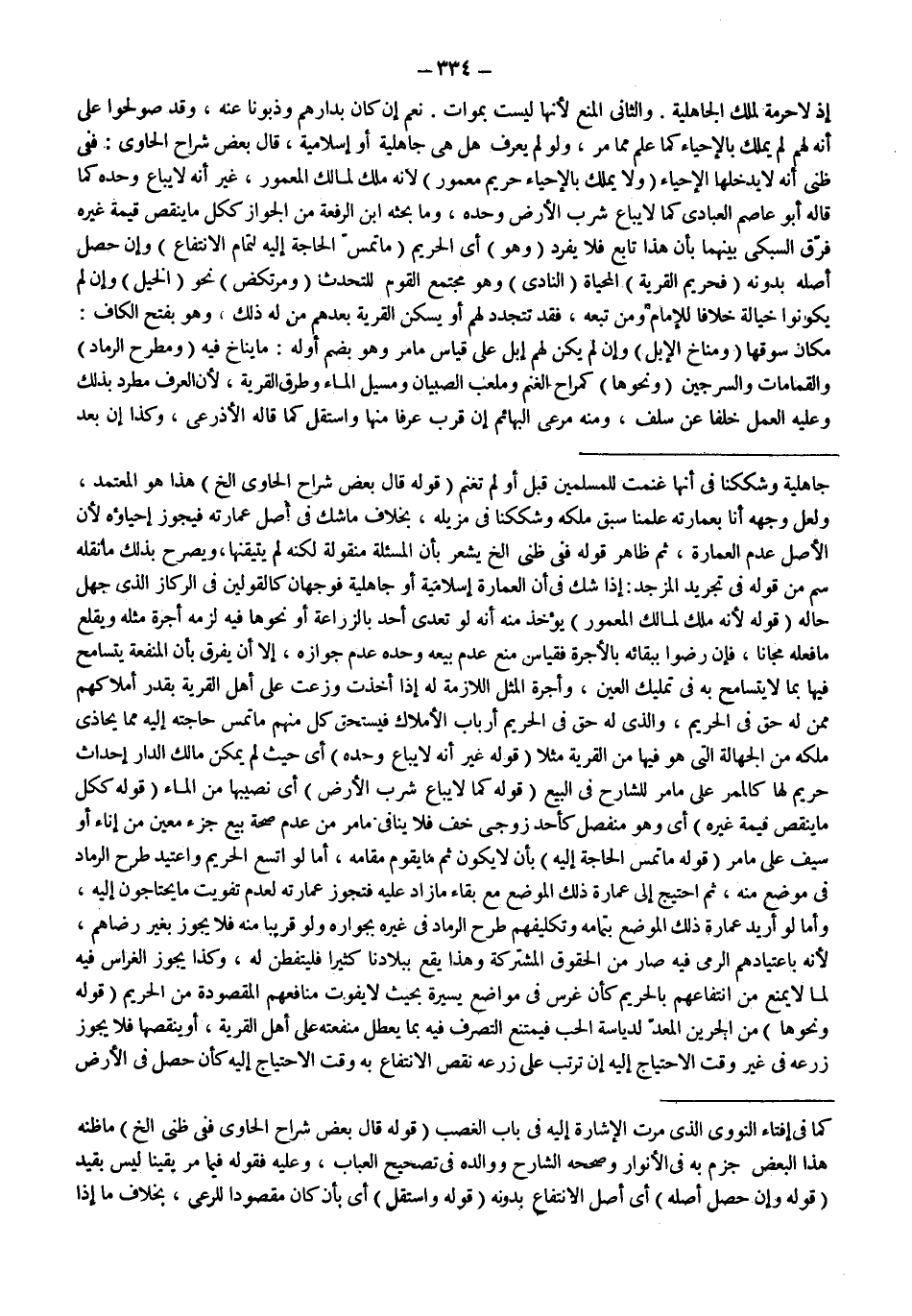 (قَوْلُهُ: لِأَنَّهُ مِلْكٌ لِمَالِكِ الْمَعْمُورِ) يُؤْخَذُ مِنْهُ أَنَّهُ لَوْ تَعَدَّى أَحَدٌ بِالزِّرَاعَةِ أَوْ نَحْوِهَا فِيهِ لَزِمَهُ أُجْرَةُ مِثْلِهِ وَيَقْلَعُ مَا فَعَلَهُ مَجَّانًا، فَإِنْ رَضُوا بِبَقَائِهِ بِالْأُجْرَةِ فَقِيَاسُ مَنْعِ عَدَمِ بَيْعِهِ وَحْدَهُ عَدَمُ جَوَازِهِ، إلَّا أَنْ يُفَرَّقَ بِأَنَّ الْمَنْفَعَةَ يُتَسَامَحُ فِيهَا بِمَا لَا يُتَسَامَحُ بِهِ فِي تَمْلِيكِ الْعَيْنِ، وَأُجْرَةِ الْمِثْلِ اللَّازِمَةِ لَهُ إذَا أُخِذَتْ وُزِّعَتْ عَلَى أَهْلِ الْقَرْيَةِ بِقَدْرِ أَمْلَاكِهِمْ مِمَّنْ لَهُ حَقٌّ فِي الْحَرِيمِ، وَاَلَّذِي لَهُ حَقٌّ فِي الْحَرِيمِ أَرْبَابُ الْأَمْلَاكِ فَيَسْتَحِقُّ كُلٌّ مِنْهُمْ مَا تَمَسُّ حَاجَتُهُ إلَيْهِ مِمَّا يُحَاذِي مِلْكَهُ مِنْ الْجَهَالَةِ الَّتِي هُوَ فِيهَا مِنْ الْقَرْيَةِ مَثَلًا (قَوْلُهُ: غَيْرَ أَنَّهُ لَا يُبَاعُ وَحْدَهُ) أَيْ حَيْثُ لَمْ يُمْكِنْ مَالِكَ الدَّارِ إحْدَاثُ حَرِيمٍ لَهَا كَالْمَمَرِّ عَلَى مَا مَرَّ لِلشَّارِحِ فِي الْبَيْعِ (قَوْلُهُ: كَمَا لَا يُبَاعُ شِرْبُ الْأَرْضِ) أَيْ نَصِيبُهَا مِنْ الْمَاءِ (قَوْلُهُ: كَكُلِّ مَا يَنْقُصُ قِيمَةَ غَيْرِهِ) أَيْ وَهُوَ مُنْفَصِلٌ كَأَحَدِ زَوْجَيْ خُفٍّ فَلَا يُنَافِي مَا مَرَّ مِنْ عَدَمِ صِحَّةِ بَيْعِ جُزْءٍ مُعَيَّنٍ مِنْ إنَاءٍ أَوْ سَيْفٍ عَلَى مَا مَرَّ (قَوْلُهُ: مَا تَمَسُّ الْحَاجَةُ إلَيْهِ) بِأَنْ لَا يَكُونَ ثَمَّ مَا يَقُومُ مَقَامَهُ، أَمَّا لَوْ اتَّسَعَ الْحَرِيمُ وَاعْتِيدَ طَرْحُ الرَّمَادِ فِي مَوْضِعٍ مِنْهُ، ثُمَّ اُحْتِيجَ إلَى عِمَارَةِ ذَلِكَ الْمَوْضِعِ مَعَ بَقَاءِ مَا زَادَ عَلَيْهِ فَتَجُوزُ عِمَارَتُهُ لِعَدَمِ تَفْوِيتِ مَا يَحْتَاجُونَ إلَيْهِ، وَأَمَّا لَوْ أُرِيدَ عِمَارَةُ ذَلِكَ الْمَوْضِعِ بِتَمَامِهِ وَتَكْلِيفُهُمْ طَرْحَ الرَّمَادِ فِي غَيْرِهِ بِجِوَارِهِ وَلَوْ قَرِيبًا مِنْهُ فَلَا يَجُوزُ بِغَيْرِ رِضَاهُمْ، لِأَنَّهُ بِاعْتِيَادِهِمْ الرَّمْيَ فِيهِ صَارَ مِنْ الْحُقُوقِ الْمُشْتَرَكَةِ وَهَذَا يَقَعُ بِبِلَادِنَا كَثِيرًا فَلْيُتَفَطَّنْ لَهُ، وَكَذَا يَجُوزُ الْغِرَاسُ فِيهِ لِمَا لَا يَمْنَعُ مِنْ انْتِفَاعِهِمْ بِالْحَرِيمِ كَأَنْ غَرَسَ فِي مَوَاضِعَ يَسِيرَةٍ بِحَيْثُ لَا يُفَوِّتُ مَنَافِعَهُمْ الْمَقْصُودَةَ مِنْ الْحَرِيمِ