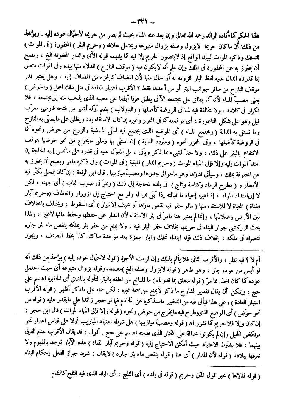 ـــــــــــــــــــــــــــــSأَمْ لَا؟ فِيهِ نَظَرٌ، وَالْأَقْرَبُ الثَّانِي فَلَا يَأْثَمُ بِذَلِكَ وَإِنْ لَزِمَتْ الْأُجْرَةُ (قَوْلُهُ: لِاحْتِمَالِ عَوْدِهِ إلَيْهِ) يُؤْخَذُ مِنْ ذَلِكَ أَنَّهُ لَوْ أَيِسَ مِنْ عَوْدِهِ جَازَ، وَهُوَ ظَاهِرٌ (قَوْلُهُ: لَا يَزُولُ وَصْفُهُ إلَخْ) مُعْتَمَدٌ، وَقَوْلُهُ بِزَوَالِ مَتْبُوعِهِ أَيْ حَيْثُ احْتَمَلَ عَوْدَهُ كَمَا كَانَ أَخْذًا مِمَّا مَرَّ (قَوْلُهُ مُتَعَلَّقٌ بِمَا قَدَّرْنَاهُ) مَا الْمَانِعُ مِنْ تَعَلُّقِهِ بِالْبِئْرِ لِتَأَوُّلِهِ بِالْمُشْتَقِّ أَيْ الْحَفِيرَةِ اهـ سم عَلَى حَجّ، وَيُمْكِنُ أَنْ يُقَالَ تَقْدِيرُ الشَّارِحِ مَا ذَكَرَ لَا يَمْنَعُ مِنْ صِحَّةِ غَيْرِهِ، لَكِنَّ حَمْلَهُ عَلَى مَا ذُكِرَ أَظْهَرُ (قَوْلُهُ الْأَقْرَبُ اعْتِبَارُ الْعَادَةِ) وَعَلَى هَذَا فَيَأْتِي فِيهِ مِنْ التَّخْيِيرِ مَا سَنَذْكُرُهُ عَنْ الْخَادِمِ فِيمَا لَوْ حَجَرَ زَائِدًا عَلَى مَا يَقْدِرُ عَلَيْهِ (قَوْلُهُ: مِنْ نَحْوِ حَوْضٍ) أَيْ الْمَوْضِعِ الَّذِي يُطْرَحُ فِيهِ مَا يَخْرُجُ مِنْ حَوْضٍ وَنَحْوِهِ (قَوْلُهُ: وَإِلَّا فَإِلَى انْتِهَاءِ الْمَوَاتِ) قَالَ ابْنُ حَجَرٍ: إنْ كَانَ وَإِلَّا فَلَا حَرِيمَ كَمَا تَقَرَّرَ اهـ (قَوْلُهُ: وَمَصَبُّ مَيَازِيبِهَا) هَلْ شَرْطُهُ اعْتِيَادُ الْمَيَازِيبِ أَوْ لَا عَلَى قِيَاسِ اعْتِبَارِ نَحْوِ مُرْتَكَضِ الْخَيْلِ وَإِنْ لَمْ يَكُونُوا خَيَّالَةً عَلَى الْمُخْتَارِ الَّذِي قَدَّمْته اهـ سم عَلَى حَجّ.