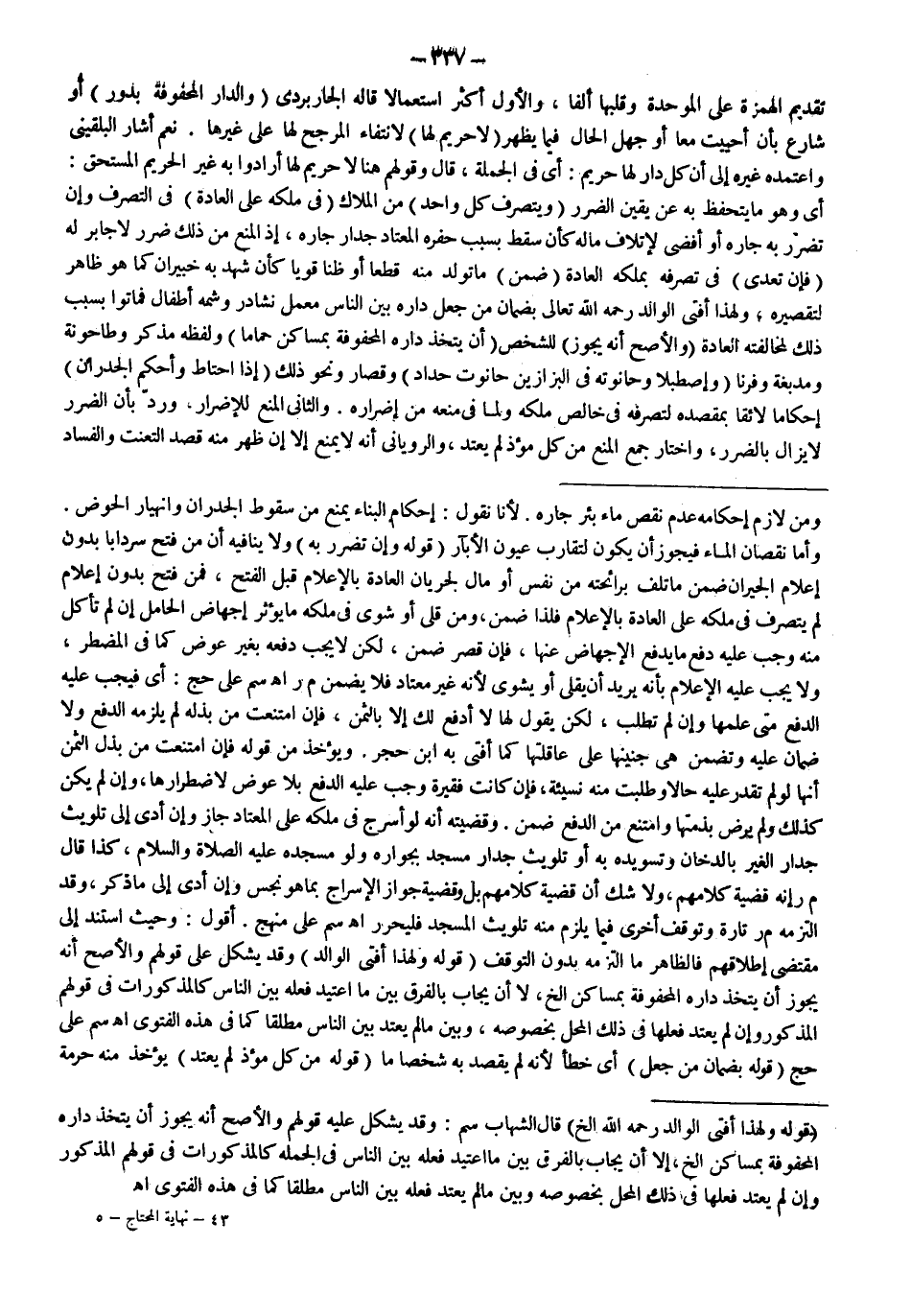 أَقُولُ: وَحَيْثُ اسْتَنَدَ إلَى مُقْتَضَى إطْلَاقِهِمْ فَالظَّاهِرُ مَا الْتَزَمَهُ بِدُونِ التَّوَقُّفِ (قَوْلُهُ وَلِهَذَا أَفْتَى الْوَالِدُ) وَقَدْ يُشْكِلُ عَلَى قَوْلِهِمْ وَالْأَصَحُّ أَنَّهُ يَجُوزُ أَنْ يَتَّخِذَ دَارِهِ الْمَحْفُوفَةَ بِمَسَاكِنَ إلَخْ، لَا أَنْ يُجَابَ بِالْفَرْقِ بَيْنَ مَا اُعْتِيدَ فِعْلُهُ بَيْنَ النَّاسِ كَالْمَذْكُورَاتِ فِي قَوْلِهِمْ الْمَذْكُورِ وَإِنْ لَمْ يَعْتَدْ فِعْلَهَا فِي ذَلِكَ الْمَحِلِّ بِخُصُوصِهِ، وَبَيَّنَ مَا لَمْ يُعْتَدْ بَيْنَ النَّاسِ مُطْلَقًا كَمَا فِي هَذِهِ الْفَتْوَى اهـ سم عَلَى حَجّ (قَوْلُهُ: بِضَمَانِ مَنْ جَعَلَ) أَيْ خَطَأً لِأَنَّهُ لَمْ يَقْصِدْ بِهِ شَخْصًا مَا (قَوْلُهُ: مِنْ كُلِّ مُؤْذٍ لَمْ يَعْتَدْ) يُؤْخَذُ مِنْهُ حُرْمَةُ