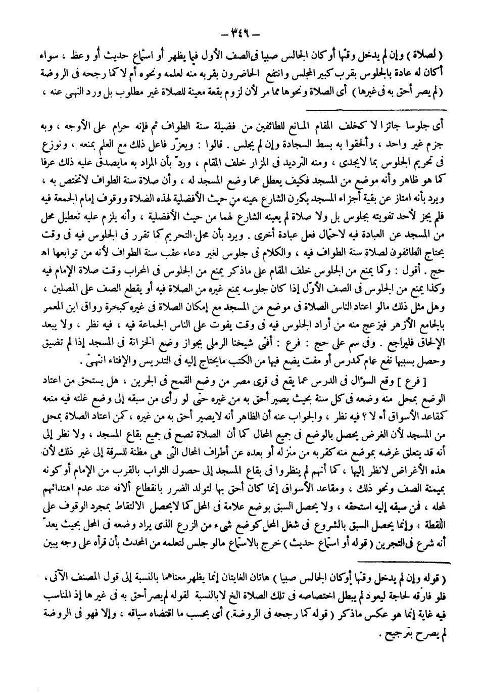 أَقُولُ: وَكَمَا يُمْنَعُ مِنْ الْجُلُوسِ خَلْفَ الْمَقَامِ عَلَى مَا ذَكَرَ يُمْنَعُ مِنْ الْجُلُوسِ فِي الْمِحْرَابِ وَقْتَ صَلَاةِ الْإِمَامِ فِيهِ وَكَذَا يُمْنَعُ مِنْ الْجُلُوسِ فِي الصَّفِّ الْأَوَّلِ إذَا كَانَ جُلُوسُهُ يَمْنَعُ غَيْرَهُ مِنْ الصَّلَاةِ فِيهِ أَوْ يَقْطَعُ الصَّفَّ عَلَى الْمُصَلِّينَ، وَهَلْ مِثْلُ ذَلِكَ مَا لَوْ اعْتَادَ النَّاسُ الصَّلَاةَ فِي مَوْضِعٍ مِنْ الْمَسْجِدِ مَعَ إمْكَانِ الصَّلَاةِ فِي غَيْرِهِ كَبَحْرَةِ رُوَاقِ ابْنِ الْمُعَمَّرِ بِالْجَامِعِ الْأَزْهَرِ فَيَزْعَجَ مِنْهُ مَنْ أَرَادَ الْجُلُوسَ فِيهِ فِي وَقْتٍ يُفَوِّتُ عَلَى النَّاسِ الْجَمَاعَةَ فِيهِ، فِيهِ نَظَرٌ، وَلَا يَبْعُدُ الْإِلْحَاقُ فَلْيُرَاجَعْ.