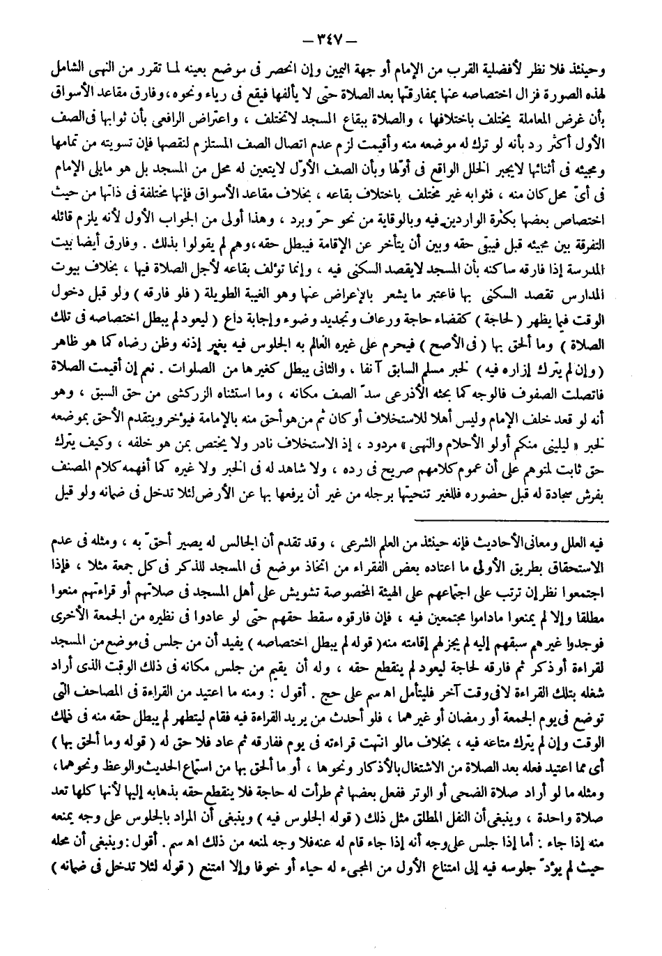 وَحِينَئِذٍ فَلَا نَظَرَ لِأَفْضَلِيَّةِ الْقُرْبِ مِنْ الْإِمَامِ أَوْ جِهَةِ الْيَمِينِ وَإِنْ انْحَصَرَ فِي مَوْضِعٍ بِعَيْنِهِ لِمَا تَقَرَّرَ مِنْ النَّهْيِ الشَّامِلِ لِهَذِهِ الصُّورَةِ فَزَالَ اخْتِصَاصُهُ عَنْهَا بِمُفَارَقَتِهَا بَعْدَ الصَّلَاةِ حَتَّى لَا يَأْلَفَهَا فَيَقَعَ فِي رِيَاءٍ وَنَحْوِهِ، وَفَارَقَ مَقَاعِدَ الْأَسْوَاقِ بِأَنَّ غَرَضَ الْمُعَامَلَةِ يَخْتَلِفُ بِاخْتِلَافِهَا، وَالصَّلَاةُ بِبِقَاعِ الْمَسْجِدِ لَا تَخْتَلِفُ، وَاعْتِرَاضُ الرَّافِعِيِّ بِأَنَّ ثَوَابَهَا فِي الصَّفِّ الْأَوَّلِ أَكْثَرُ رُدَّ بِأَنَّهُ لَوْ تَرَكَ لَهُ مَوْضِعَهُ مِنْهُ وَأُقِيمَتْ لَزِمَ عَدَمُ اتِّصَالِ الصَّفِّ الْمُسْتَلْزِمِ لِنَقْصِهَا فَإِنَّ تَسْوِيَتَهُ مِنْ تَمَامِهَا وَمَجِيئُهُ فِي أَثْنَائِهَا لَا يَجْبُرُ الْخَلَلَ الْوَاقِعَ فِي أَوَّلِهَا وَبِأَنَّ الصَّفَّ الْأَوَّلَ لَا يَتَعَيَّنُ لَهُ مَحِلٌّ مِنْ الْمَسْجِدِ بَلْ هُوَ مَا يَلِي الْإِمَامَ فِي أَيِّ مَحِلٍّ كَانَ مِنْهُ، فَثَوَابُهُ غَيْرُ مُخْتَلِفٍ بِاخْتِلَافِ بِقَاعِهِ، بِخِلَافِ مَقَاعِدِ الْأَسْوَاقِ فَإِنَّهَا مُخْتَلِفَةٌ فِي ذَاتِهَا مِنْ حَيْثُ اخْتِصَاصِ بَعْضِهَا بِكَثْرَةِ الْوَارِدِينَ فِيهِ وَبِالْوِقَايَةِ مِنْ نَحْوِ حَرٍّ وَبَرْدٍ، وَهَذَا أَوْلَى مِنْ الْجَوَابِ الْأَوَّلِ لِأَنَّهُ يَلْزَمُ قَائِلَهُ التَّفْرِقَةُ بَيْنَ مَجِيئِهِ قَبْلُ فَيَبْقَى حَقُّهُ وَبَيْنَ أَنْ يَتَأَخَّرَ عَنْ الْإِقَامَةِ فَيَبْطُلَ حَقُّهُ، وَهُمْ لَمْ يَقُولُوا بِذَلِكَ.