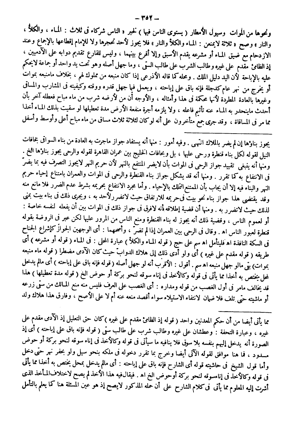 وَقَالَ فِي الرَّحَى بَيْنَ الْعُمْرَانِ إذَا لَمْ تَضُرَّ، وَأَصَحُّهُمَا: أَيْ الْوَجْهَيْنِ الْجَوَازُ كَإِشْرَاعِ الْجَنَاحِ فِي السِّكَّةِ النَّافِذَةِ اهـ فَلْيُتَأَمَّلْ اهـ سم عَلَى حَجّ (قَوْلُهُ: الْمَاءُ وَالْكَلَأُ) عِبَارَةُ الْمَحَلِّيِّ: فِي الْمَاءِ (قَوْلُهُ: أَوْ مُشْرَعِهِ) أَيْ طَرِيقِهِ (قَوْلُهُ: مُقَدَّمٌ عَلَى غَيْرِهِ) أَيْ وَلَوْ أَدَّى ذَلِكَ إلَى هَلَاكِ الدَّوَابِّ حَيْثُ كَانَ الْآدَمِيُّ مُضْطَرًّا (قَوْلُهُ: مَاءٌ مَنْبَعُهُ بِمَوَاتٍ) بَقِيَ مَا لَوْ جُهِلَ مَنْبَعُهُ اهـ سم.