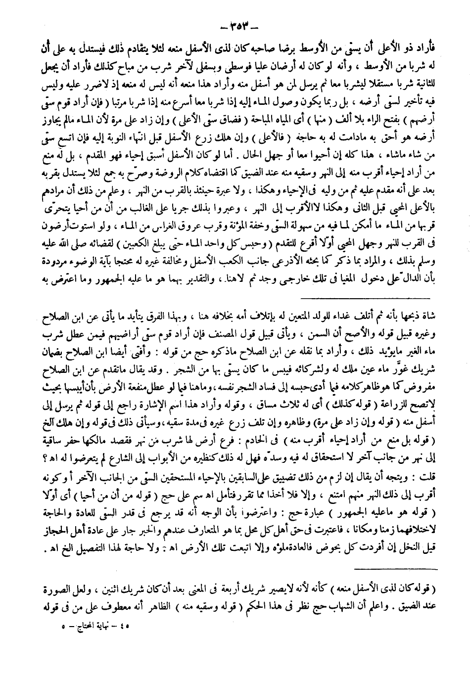 وَقَدْ يُقَالُ مَا تَقَدَّمَ عَنْ ابْنِ الصَّلَاحِ مَفْرُوضٌ كَمَا هُوَ ظَاهِرُ كَلَامِهِ فِيمَا أَدَّى حَبْسُهُ إلَى فَسَادِ الشَّجَرِ نَفْسِهِ، وَمَا هُنَا فِيمَا لَوْ عَطَّلَ مَنْفَعَةَ الْأَرْضِ بِأَنْ أَيْبَسَهَا بِحَيْثُ لَا تَصِحُّ لِلزِّرَاعَةِ (قَوْلُهُ كَذَلِكَ) أَيْ لَهُ ثَلَاثُ مَسَاقٍ، وَقَوْلُهُ " وَأَرَادَ هَذَا " اسْمُ الْإِشَارَةِ رَاجِعٌ إلَى قَوْلِهِ ثُمَّ يُرْسِلُ إلَى أَسْفَلَ مِنْهُ (قَوْلُهُ: وَإِنْ زَادَ عَلَى مَرَّةٍ) وَظَاهِرُهُ وَإِنْ تَلِفَ زَرْعُ غَيْرِهِ فِي مُدَّةِ سَقْيِهِ، وَسَيَأْتِي ذَلِكَ فِي قَوْلِهِ وَإِنْ هَلَكَ إلَخْ (قَوْلُهُ: بَلْ مُنِعَ مَنْ أَرَادَ إحْيَاءَ أَقْرَبَ مِنْهُ) فِي الْخَادِمِ: فَرْعٌ أَرْضٌ لَهَا شِرْبٌ مِنْ نَهْرٍ فَقَصَدَ مَالِكُهَا حَفْرَ سَاقِيَةٍ إلَى نَهْرٍ مِنْ جَانِبٍ آخَرَ لَا اسْتِحْقَاقَ لَهُ فِيهِ وَسَدَّهُ فَهَلْ لَهُ ذَلِكَ كَنَظِيرِهِ مِنْ الْأَبْوَابِ إلَى الشَّارِعِ لَمْ يَتَعَرَّضُوا لَهُ اهـ؟ قُلْت: وَيَتَّجِهُ أَنْ يُقَالَ إنْ لَزِمَ مِنْ ذَلِكَ تَضْيِيقٌ عَلَى السَّابِقِينَ بِالْإِحْيَاءِ الْمُسْتَحَقِّينَ السَّقْيَ مِنْ الْجَانِبِ الْآخَرِ أَوْ كَوْنِهِ أَقْرَبَ إلَى ذَلِكَ النَّهْرِ مِنْهُمْ امْتَنَعَ، وَإِلَّا فَلَا أَخْذًا مِمَّا تَقَرَّرَ فَتَأَمَّلْ اهـ سم عَلَى حَجّ (قَوْلُهُ: مِنْ أَنَّ مَنْ أَحْيَا) أَيْ أَوَّلًا (قَوْلُهُ: هُوَ مَا عَلَيْهِ الْجُمْهُورُ) عِبَارَةُ حَجّ: وَاعْتَرَضُوا بِأَنَّ الْوَجْهَ أَنَّهُ قَدْ يُرْجَعُ فِي قَدْرِ السَّقْيِ لِلْعَادَةِ وَالْحَاجَةِ لِاخْتِلَافِهِمَا زَمَنًا وَمَكَانًا، فَاعْتُبِرَتْ فِي حَقِّ أَهْلِ كُلِّ مَحِلٍّ بِمَا هُوَ الْمُتَعَارَفُ عِنْدَهُمْ وَالْخَبَرُ جَارٍ عَلَى عَادَةِ أَهْلِ الْحِجَازِ قِيلَ النَّخْلُ إنْ أُفْرِدَتْ كُلٌّ بِحَوْضٍ فَالْعَادَةُ مِلْؤُهُ وَإِلَّا اُتُّبِعَتْ تِلْكَ الْأَرْضُ اهـ: وَلَا حَاجَةَ لِهَذَا التَّفْصِيلِ إلَخْ اهـ.