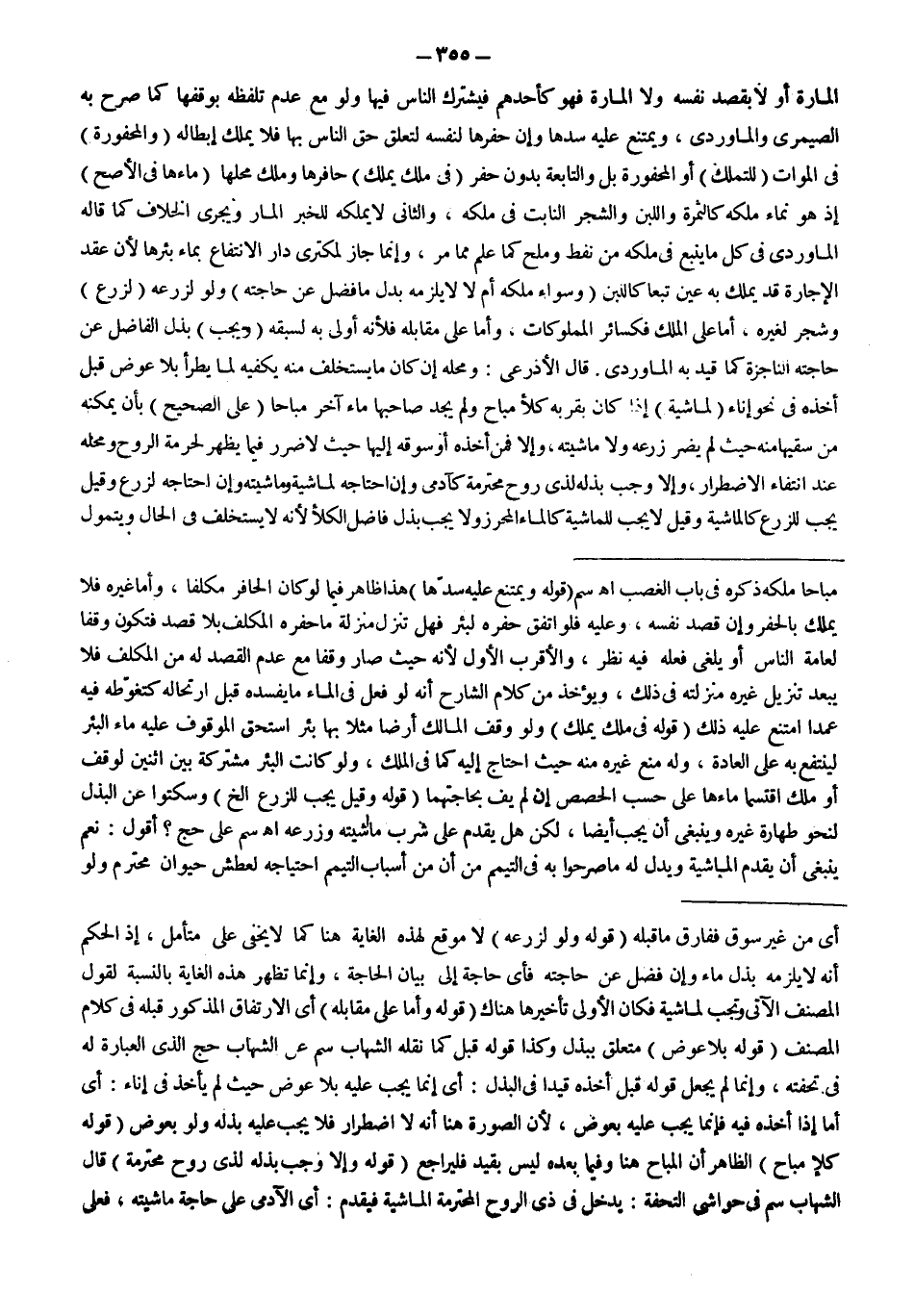 ـــــــــــــــــــــــــــــSمُبَاحًا مَلَكَهُ ذَكَرَهُ فِي بَابِ الْغَصْبِ اهـ سم (قَوْلُهُ: وَيَمْتَنِعُ عَلَيْهِ سَدُّهَا) هَذَا ظَاهِرٌ فِيمَا لَوْ كَانَ الْحَافِرُ مُكَلَّفًا، وَأَمَّا غَيْرُهُ فَلَا يَمْلِكُ بِالْحَفْرِ وَإِنْ قَصَدَ نَفْسَهُ، وَعَلَيْهِ فَلَوْ اتَّفَقَ حَفْرُهُ لِبِئْرٍ فَهَلْ تَنْزِلُ مَنْزِلَةَ مَا حَفَرَهُ الْمُكَلَّفُ بِلَا قَصْدٍ فَتَكُونُ وَقْفًا لِعَامَّةِ النَّاسِ أَوْ يُلْغَى فِعْلُهُ؟ فِيهِ نَظَرٌ، وَالْأَقْرَبُ الْأَوَّلُ لِأَنَّهُ حَيْثُ صَارَ وَقْفًا مَعَ عَدَمِ الْقَصْدِ لَهُ مِنْ الْمُكَلَّفِ فَلَا يَبْعُدُ تَنْزِيلُ غَيْرِهِ مَنْزِلَتَهُ فِي ذَلِكَ، وَيُؤْخَذُ مِنْ كَلَامِ الشَّارِحِ أَنَّهُ لَوْ فَعَلَ فِي الْمَاءِ مَا يُفْسِدُهُ قَبْلَ ارْتِحَالِهِ كَتَغَوُّطِهِ فِيهِ عَمْدًا امْتَنَعَ عَلَيْهِ ذَلِكَ (قَوْلُهُ: فِي مِلْكٍ يُمْلَكُ) وَلَوْ وَقَفَ الْمَالِكُ أَرْضًا مَثَلًا بِهَا بِئْرٌ اسْتَحَقَّ الْمَوْقُوفُ عَلَيْهِ مَاءِ الْبِئْرِ لِيَنْتَفِعَ بِهِ عَلَى الْعَادَةِ، وَلَهُ مَنْعُ غَيْرِهِ مِنْهُ حَيْثُ احْتَاجَ إلَيْهِ كَمَا فِي الْمِلْكِ، وَلَوْ كَانَتْ الْبِئْرُ مُشْتَرَكَةً بَيْنَ اثْنَيْنِ لِوَقْفٍ أَوْ مِلْكٍ اقْتَسَمَا مَاءَهَا عَلَى حَسَبِ الْحِصَصِ إنْ لَمْ يَفِ بِحَاجَتِهِمَا (قَوْلُهُ: وَقِيلَ يَجِبُ لِلزَّرْعِ إلَخْ) وَسَكَتُوا عَنْ الْبَذْلِ لِنَحْوِ طَهَارَةِ غَيْرِهِ وَيَنْبَغِي أَنْ يَجِبَ أَيْضًا، لَكِنْ هَلْ يُقْدِمُ عَلَى شُرْبِ مَاشِيَتِهِ وَزَرْعِهِ اهـ سم عَلَى حَجّ؟ أَقُولُ: نَعَمْ يَنْبَغِي أَنْ يُقْدِمَ الْمَاشِيَةَ وَيَدُلُّ لَهُ مَا صَرَّحُوا بِهِ فِي التَّيَمُّمِ مِنْ أَنَّ مِنْ أَسْبَابِ التَّيَمُّمِ احْتِيَاجَهُ لِعَطَشِ حَيَوَانٍ مُحْتَرَمٍ وَلَوْ