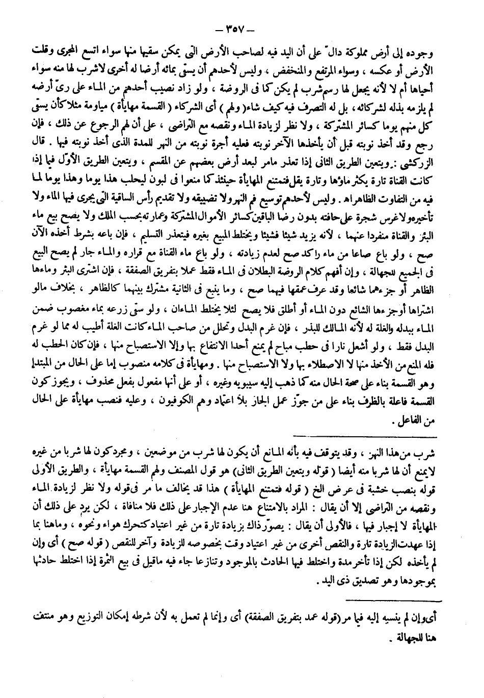 قَالَ الزَّرْكَشِيُّ: وَيَتَعَيَّنُ الطَّرِيقُ الثَّانِي إذَا تَعَذَّرَ مَا مَرَّ لِبُعْدِ أَرْضِ بَعْضِهِمْ عَنْ الْمُقْسَمِ، وَيَتَعَيَّنُ الطَّرِيقُ الْأَوَّلُ فِيمَا إذَا كَانَتْ الْقَنَاةُ تَارَةً يَكْثُرُ مَاؤُهَا وَتَارَةً يَقِلُّ فَتَمْتَنِعَ الْمُهَايَأَةُ حِينَئِذٍ كَمَا مَنَعُوا فِي لَبُونٍ لِيَحْلِبَ هَذَا يَوْمًا وَهَذَا يَوْمًا لِمَا فِيهِ مِنْ التَّفَاوُتِ الظَّاهِرِ اهـ.