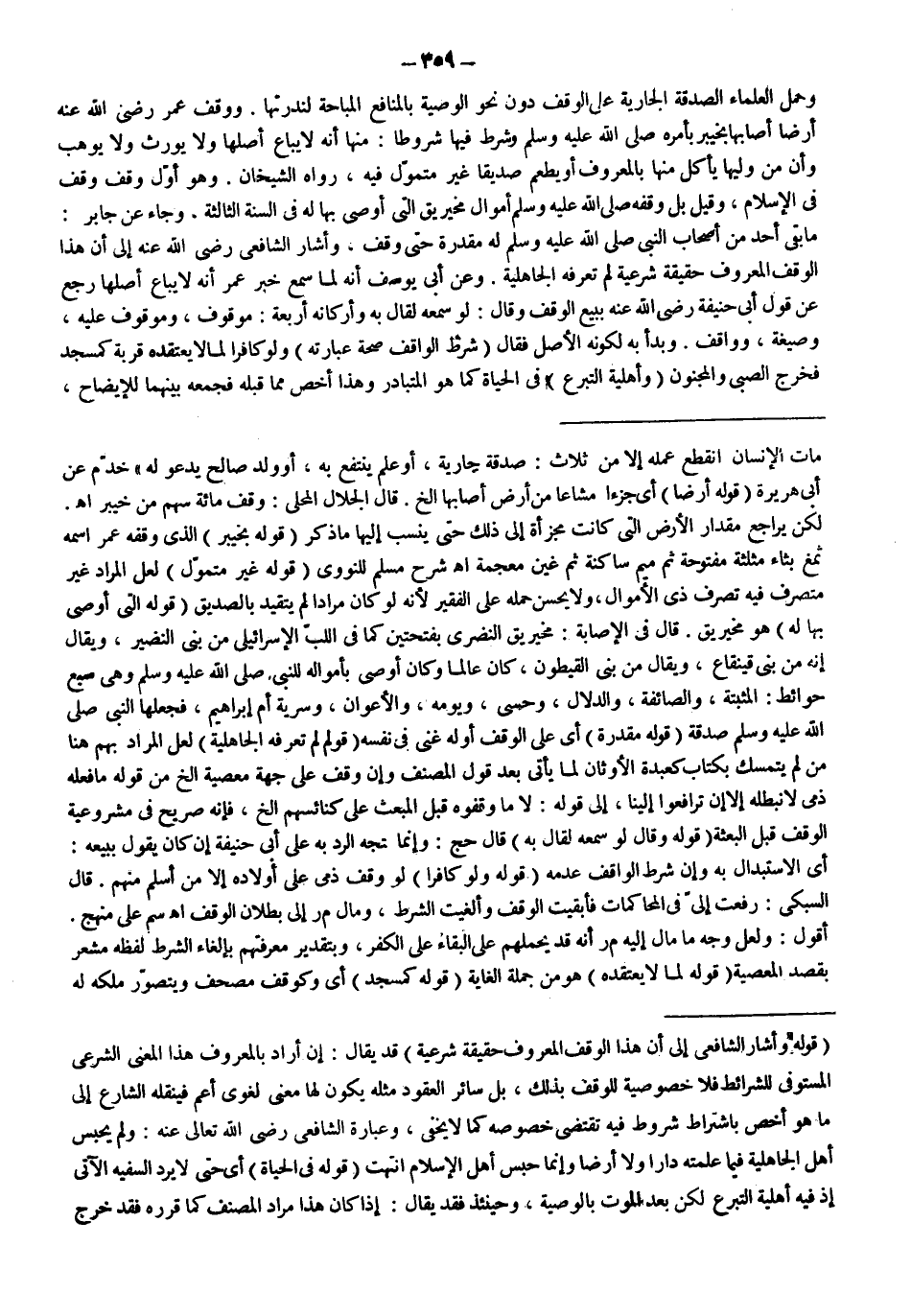 وَحَمَلَ الْعُلَمَاءُ الصَّدَقَةَ الْجَارِيَةَ عَلَى الْوَقْفِ دُونَ نَحْوِ الْوَصِيَّةِ بِالْمَنَافِعِ الْمُبَاحَةِ لِنُدْرَتِهَا. «وَوَقَفَ عُمَرُ - رَضِيَ اللَّهُ عَنْهُ - أَرْضًا أَصَابَهَا بِخَيْبَرَ بِأَمْرِهِ - صَلَّى اللَّهُ عَلَيْهِ وَسَلَّمَ - وَشَرَطَ فِيهَا شُرُوطًا: مِنْهَا أَنَّهُ لَا يُبَاعُ أَصْلُهَا وَلَا يُورَثُ وَلَا يُوهَبُ وَأَنَّ مَنْ وَلِيَهَا يَأْكُلُ مِنْهَا بِالْمَعْرُوفِ أَوْ يُطْعِمُ صَدِيقًا غَيْرَ مُتَمَوِّلٍ فِيهِ» ، رَوَاهُ الشَّيْخَانِ. وَهُوَ أَوَّلُ وَقْفٍ وُقِفَ فِي الْإِسْلَامِ، وَقِيلَ: بَلْ «وَقَفَهُ - صَلَّى اللَّهُ عَلَيْهِ وَسَلَّمَ - أَمْوَالَ مُخَيْرِيقٍ الَّتِي أَوْصَى بِهَا لَهُ فِي السَّنَةِ الثَّالِثَةِ» . وَجَاءَ عَنْ جَابِرٍ: مَا بَقِيَ أَحَدٌ مِنْ أَصْحَابِ النَّبِيِّ - صَلَّى اللَّهُ عَلَيْهِ وَسَلَّمَ - لَهُ مَقْدِرَةٌ حَتَّى وَقَفَ.