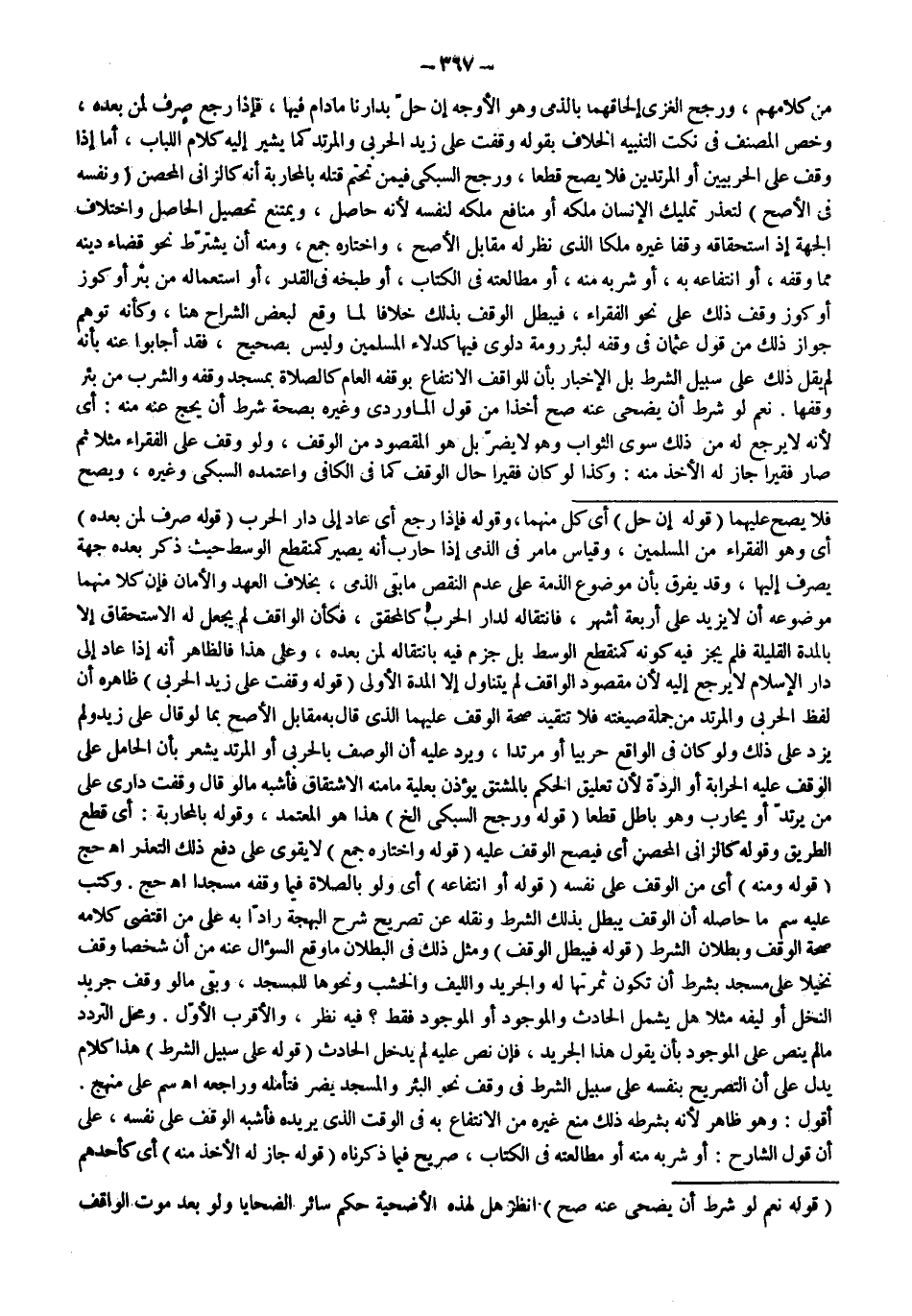 مِنْ كَلَامِهِمْ، وَرَجَّحَ الْغَزِّيِّ إلْحَاقَهُمَا بِالذِّمِّيِّ وَهُوَ الْأَوْجَهُ إنْ حَلَّ بِدَارِنَا مَا دَامَ فِيهَا، فَإِذَا رَجَعَ صُرِفَ لِمَنْ بَعْدَهُ، وَخَصَّ الْمُصَنِّفُ فِي نُكَتِ التَّنْبِيهِ الْخِلَافَ بِقَوْلِهِ وَقَفْت عَلَى زَيْدٍ الْحَرْبِيِّ وَالْمُرْتَدِّ كَمَا يُشِيرُ إلَيْهِ كَلَامُ اللُّبَابِ، أَمَّا إذَا وَقَفَ عَلَى الْحَرْبِيَّيْنِ أَوْ الْمُرْتَدَّيْنِ فَلَا يَصِحُّ قَطْعًا، وَرَجَّحَ السُّبْكِيُّ فِيمَنْ تَحَتَّمَ قَتْلُهُ بِالْمُحَارَبَةِ أَنَّهُ كَالزَّانِي الْمُحْصَنِ
