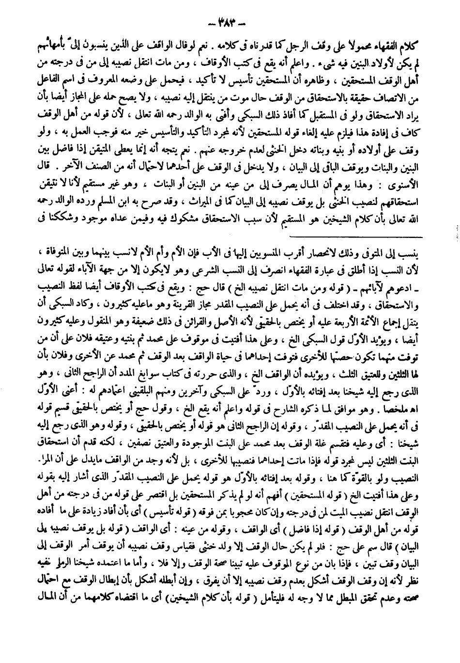 وَاعْلَمْ أَنَّهُ يَقَعُ فِي كُتُبِ الْأَوْقَافِ، وَمَنْ مَاتَ انْتَقَلَ نَصِيبُهُ إلَى مَنْ فِي دَرَجَتِهِ مِنْ أَهْلِ الْوَقْفِ الْمُسْتَحَقِّينَ، وَظَاهِرُهُ أَنَّ الْمُسْتَحَقِّينَ تَأْسِيسٌ لَا تَأْكِيدٌ، فَيُحْمَلُ عَلَى وَضْعِهِ الْمَعْرُوفِ فِي اسْمِ الْفَاعِلِ مِنْ الِاتِّصَافِ حَقِيقَةً بِالِاسْتِحْقَاقِ مِنْ الْوَقْفِ حَالَ مَوْتِ مَنْ يَنْتَقِلُ إلَيْهِ نَصِيبُهُ، وَلَا يَصِحُّ حَمْلُهُ عَلَى الْمَجَازِ أَيْضًا بِأَنْ يُرَادَ الِاسْتِحْقَاقُ وَلَوْ فِي الْمُسْتَقْبَلِ كَمَا أَفَادَ ذَلِكَ السُّبْكِيُّ وَأَفْتَى بِهِ الْوَالِدُ - رَحِمَهُ اللَّهُ تَعَالَى -، لِأَنَّ قَوْلَهُ مِنْ أَهْلِ الْوَقْفِ كَافٍ فِي إفَادَةِ هَذَا فَيَلْزَمُ عَلَيْهِ إلْغَاءُ قَوْلِهِ الْمُسْتَحَقِّينَ لِأَنَّهُ لِمُجَرَّدِ التَّأْكِيدِ وَالتَّأْسِيسِ خَيْرٌ مِنْهُ فَوَجَبَ الْعَمَلُ بِهِ، وَلَوْ وَقَفَ عَلَى أَوْلَادِهِ أَوْ بَنِيهِ وَبَنَاتِهِ دَخَلَ الْخُنْثَى لِعَدَمِ خُرُوجِهِ عَنْهُمْ.