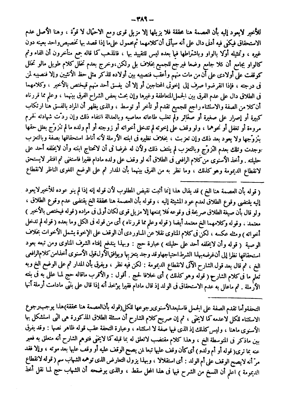 لِلْأَخِيرِ لَا يَعُودُ إلَيْهِ بِأَنَّ الْعِصْمَةَ هُنَا مُحَقَّقَةٌ فَلَا يُزِيلُهَا إلَّا مُزِيلٌ قَوِيٌّ وَمَعَ الِاحْتِمَالِ لَا قُوَّةَ، وَهُنَا الْأَصْلُ عَدَمُ الِاسْتِحْقَاقِ فَيَكْفِي فِيهِ أَدْنَى دَالٍّ عَلَى أَنَّهُ سَيَأْتِي أَنَّ كَلَامَهُمَا ثَمَّ مَحْمُولٌ عَلَى مَا إذَا قَصَدَ بِهَا تَخْصِيصَ وَاحِدٍ بِعَيْنِهِ دُونَ غَيْرِهِ، وَتَمْثِيلُهُ أَوَّلًا بِالْوَاوِ وَبِاشْتِرَاطِهَا فِيمَا بَعْدَهُ لَيْسَ لِلتَّقْيِيدِ بِهَا، فَالْمَذْهَبُ كَمَا قَالَهُ جَمْعٌ مُتَأَخِّرُونَ أَنَّ الْفَاءَ وَثُمَّ كَالْوَاوِ بِجَامِعِ أَنَّ كُلًّا جَامِعٌ وَضْعًا فَيَرْجِعُ لِلْجَمِيعِ بِخِلَافِ بَلْ وَلَكِنْ، وَخَرَجَ بِعَدَمِ تَخَلُّلِ كَلَامٍ طَوِيلٍ مَا لَوْ تَخَلَّلَ كَوَقَفْتُ عَلَى أَوْلَادِي عَلَى أَنَّ مَنْ مَاتَ مِنْهُمْ وَأَعْقَبَ فَنَصِيبُهُ بَيْنَ أَوْلَادِهِ لِلذَّكَرِ مِثْلُ حَظِّ الْأُنْثَيَيْنِ وَإِلَّا فَنَصِيبُهُ لِمَنْ فِي دَرَجَتِهِ، فَإِذَا انْقَرَضُوا صُرِفَ إلَى إخْوَتِي الْمُحْتَاجِينَ أَوْ إلَّا أَنْ يَفْسُقَ أَحَدٌ مِنْهُمْ فَيَخْتَصُّ الْأَخِيرُ، وَكَلَامُهُمَا فِي الطَّلَاقِ دَالٌّ عَلَى عَدَمِ الْفَرْقِ بَيْنَ الْجُمَلِ الْمُتَعَاطِفَةِ وَغَيْرِهَا وَإِنْ بَحَثَ بَعْضُ الشُّرَّاحِ الْفَرْقَ بَيْنَهُمَا، وَعُلِمَ مِمَّا قَرَرْنَاهُ أَنَّ كُلًّا مِنْ الصِّفَةِ وَالِاسْتِثْنَاءِ رَاجِعٌ لِلْجَمِيعِ تَقَدَّمَ أَوْ تَأَخَّرَ أَوْ تَوَسَّطَ، وَاَلَّذِي يَظْهَرُ أَنَّ الْمُرَادَ بِالْفِسْقِ هُنَا ارْتِكَابُ كَبِيرَةٍ أَوْ إصْرَارٌ عَلَى صَغِيرَةٍ أَوْ صَغَائِرَ وَلَمْ تَغْلِبْ طَاعَاتُهُ مَعَاصِيَهُ وَبِالْعَدَالَةِ انْتِفَاءُ ذَلِكَ وَإِنْ رُدَّتْ شَهَادَتُهُ لِخَرْمِ مُرُوءَةٍ أَوْ تَغَفُّلٍ أَوْ نَحْوِهِمَا، وَلَوْ وَقَفَ عَلَى إخْوَتِهِ لَمْ تَدْخُلْ أَخَوَاتُهُ أَوْ زَوْجَتُهُ أَوْ أُمُّ وَلَدِهِ مَا لَمْ تَتَزَوَّجْ بَطَلَ حَقُّهَا بِتَزَوُّجِهَا وَلَا يَعُودُ بَعْدَ ذَلِكَ وَإِنْ تَعَزَّبَتْ، بِخِلَافِ نَظِيرِهِ فِي ابْنَتِهِ الْأَرْمَلَةِ لِأَنَّهُ أَنَاطَ اسْتِحْقَاقَهَا بِصِفَةٍ وَبِالتَّعَزُّبِ وُجِدَتْ وَتِلْكَ بِعَدَمِ التَّزَوُّجِ وَبِالتَّعَزُّبِ لَمْ يَنْتَفِ ذَلِكَ وَلِأَنَّ لَهُ غَرَضًا.