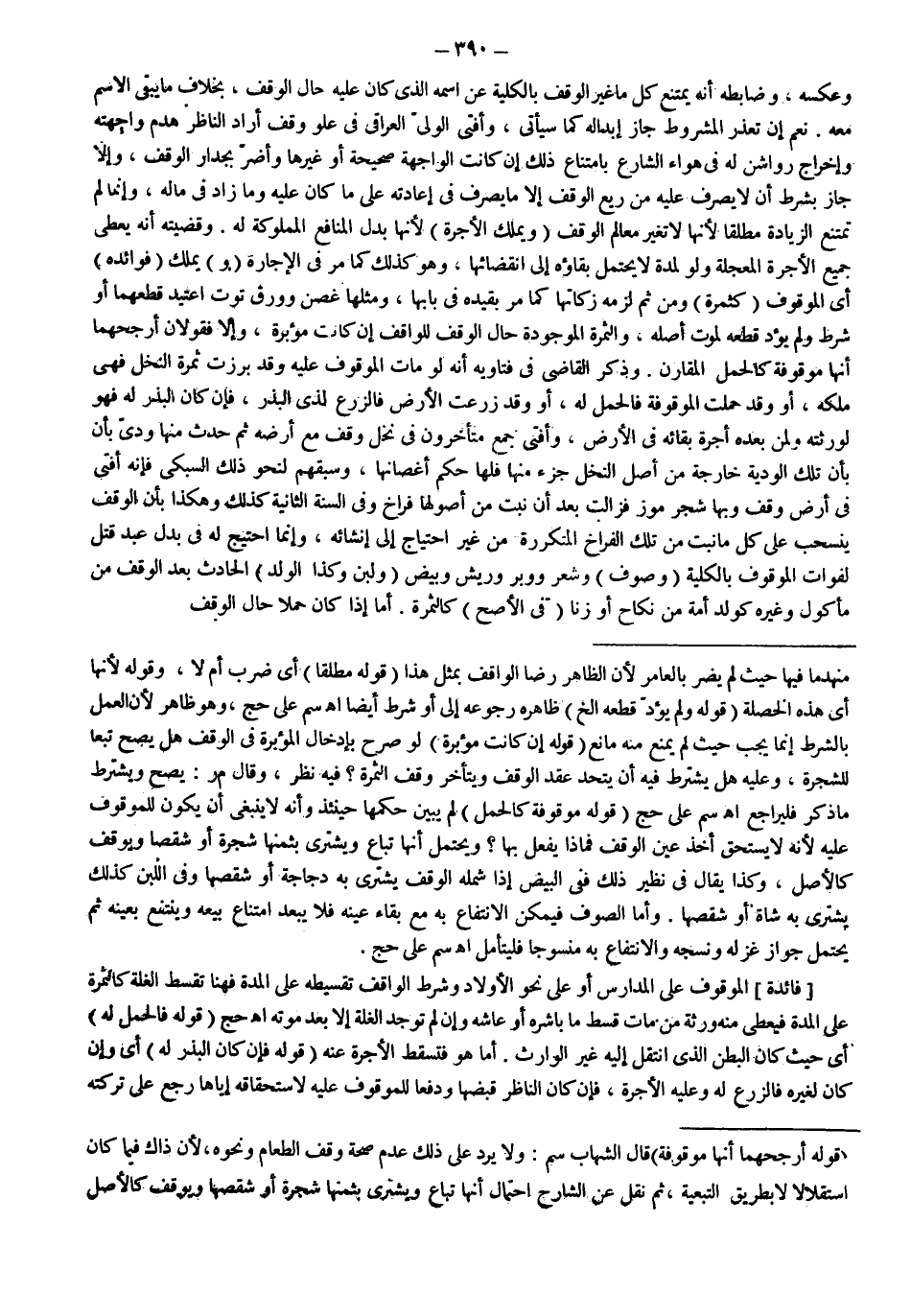 وَقَضِيَّتُهُ أَنَّهُ يُعْطِي جَمِيعَ الْأُجْرَةِ الْمُعَجَّلَةِ وَلَوْ لِمُدَّةٍ لَا يَحْتَمِلُ بَقَاؤُهُ إلَى انْقِضَائِهَا، وَهُوَ كَذَلِكَ كَمَا مَرَّ فِي الْإِجَارَةِ (وَ) يَمْلِكُ (فَوَائِدَهُ) أَيْ الْمَوْقُوفُ (كَثَمَرَةٍ) وَمِنْ ثَمَّ لَزِمَهُ زَكَاتُهَا كَمَا مَرَّ بِقَيْدِهِ فِي بَابِهَا، وَمِثْلُهَا غُصْنٌ وَوَرَقُ تُوتٍ اُعْتِيدَ قَطْعُهُمَا أَوْ شَرَطَ وَلَمْ يُؤَدِّ قَطْعُهُ لِمَوْتِ أَصْلِهِ، وَالثَّمَرَةُ الْمَوْجُودَةُ حَالَ الْوَقْفِ لِلْوَاقِفِ إنْ كَانَتْ مُؤَبَّرَةً، وَإِلَّا فَقَوْلَانِ أَرْجَحُهُمَا أَنَّهَا مَوْقُوفَةٌ كَالْحَمْلِ الْمُقَارَنِ.