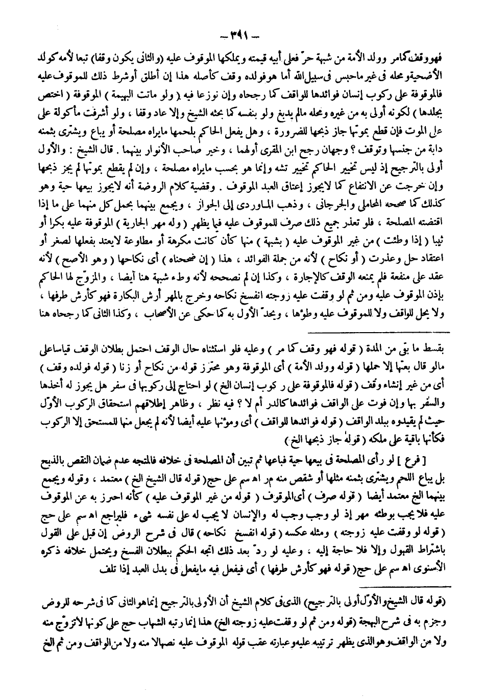 وَقَضِيَّةُ كَلَامِ الرَّوْضَةِ أَنَّهُ لَا يَجُوزُ بَيْعُهَا حَيَّةً وَهُوَ كَذَلِكَ كَمَا صَحَّحَهُ الْمَحَامِلِيُّ وَالْجُرْجَانِيُّ، وَذَهَبَ الْمَاوَرْدِيُّ إلَى الْجَوَازِ، وَيُجْمَعُ بَيْنَهُمَا بِحَمْلِ كُلٍّ مِنْهُمَا عَلَى مَا إذَا اقْتَضَتْهُ الْمَصْلَحَةُ، فَلَوْ تَعَذَّرَ جَمِيعُ ذَلِكَ صُرِفَ لِلْمَوْقُوفِ عَلَيْهِ فِيمَا يَظْهَرُ.