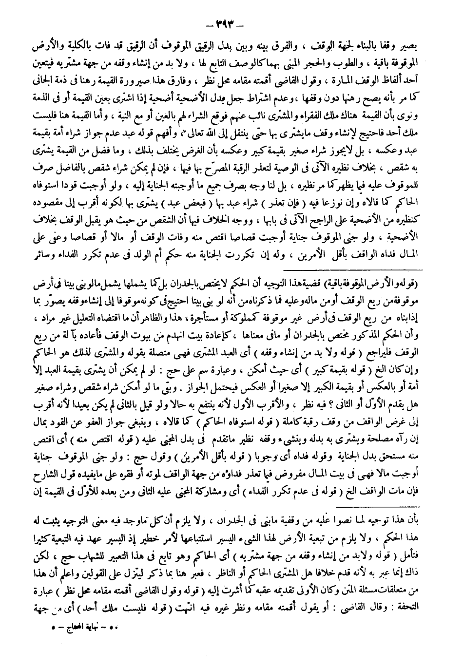 يَصِيرُ وَقْفًا بِالْبِنَاءِ لِجِهَةِ الْوَقْفِ، وَالْفَرْقُ بَيْنَهُ وَبَيْنِ بَدَلِ الرَّقِيقِ الْمَوْقُوفِ أَنَّ الرَّقِيقَ قَدْ فَاتَ بِالْكُلِّيَّةِ وَالْأَرْضُ الْمَوْقُوفَةُ بَاقِيَةٌ، وَالطُّوبُ وَالْحَجَرُ الْمَبْنِيُّ بِهِمَا كَالْوَصْفِ التَّابِعِ لَهَا، وَلَا بُدَّ مِنْ إنْشَاءِ وَقْفِهِ مِنْ جِهَةِ مُشْتَرِيهِ فَيَتَعَيَّنُ أَحَدُ أَلْفَاظِ الْوَقْفِ الْمَارَّةِ، وَقَوْلُ الْقَاضِي أَقَمْته مَقَامَهُ مَحَلُّ نَظَرٍ، وَفَارَقَ هَذَا صَيْرُورَةُ الْقِيمَةِ رَهْنًا فِي ذِمَّةِ الْجَانِي كَمَا مَرَّ بِأَنَّهُ يَصِحُّ رَهْنُهَا دُونَ وَقْفِهَا، وَعَدَمُ اشْتِرَاطِ جُعْلٍ بَدَلَ الْأُضْحِيَّةِ أُضْحِيَّةً إذَا اشْتَرَى بِعَيْنِ الْقِيمَةِ أَوْ فِي الذِّمَّةِ وَنَوَى بِأَنَّ الْقِيمَةَ هُنَاكَ مِلْكُ الْفُقَرَاءِ وَالْمُشْتَرِي نَائِبٌ عَنْهُمْ فَوَقَعَ الشِّرَاءُ لَهُمْ بَالِغِينَ أَوْ مَعَ النِّيَّةِ، وَأَمَّا الْقِيمَةُ هُنَا فَلَيْسَتْ مِلْكَ أَحَدٍ فَاحْتِيجَ لِإِنْشَاءِ وَقْفِ مَا يَشْتَرِي بِهَا حَتَّى يَنْتَقِلَ إلَى اللَّهِ تَعَالَى، وَأَفْهَمَ قَوْلُهُ عَبْدٌ عَدَمَ جَوَازِ شِرَاءِ أَمَةٍ بِقِيمَةِ عَبْدٍ وَعَكْسِهِ، بَلْ لَا يَجُوزُ شِرَاءُ صَغِيرٍ بِقِيمَةِ كَبِيرٍ وَعَكْسُهُ بِأَنَّ الْغَرَضَ يَخْتَلِفُ بِذَلِكَ، وَمَا فَضَلَ مِنْ الْقِيمَةِ يُشْتَرَى بِهِ شِقْصٌ، بِخِلَافِ نَظِيرِهِ الْآتِي فِي الْوَصِيَّةِ لِتَعَذُّرِ الرَّقَبَةِ الْمُصَرَّحِ بِهَا فِيهَا، فَإِنْ لَمْ يُمْكِنْ شِرَاءُ شِقْصٍ بِالْفَاضِلِ صُرِفَ لِلْمَوْقُوفِ عَلَيْهِ فِيمَا يَظْهَرُ كَمَا مَرَّ نَظِيرُهُ، بَلْ لَنَا وَجْهٌ بِصَرْفِ جَمِيعِ مَا أَوْجَبَتْهُ الْجِنَايَةُ إلَيْهِ، وَلَوْ أَوْجَبَتْ قَوَدًا اسْتَوْفَاهُ الْحَاكِمُ كَمَا قَالَاهُ وَإِنْ نُوزِعَا فِيهِ (فَإِنْ تَعَذَّرَ) شِرَاءُ عَبْدٍ بِهَا (فَبَعْضُ عَبْدٍ) يُشْتَرَى بِهَا لِكَوْنِهِ أَقْرَبَ إلَى مَقْصُودِهِ كَنَظِيرِهِ مِنْ الْأُضْحِيَّةِ عَلَى الرَّاجِحِ الْآتِي فِي بَابِهَا، وَوَجْهُ الْخِلَافِ فِيهَا أَنَّ الشِّقْصَ مِنْ حَيْثُ هُوَ يَقْبَلُ الْوَقْفَ بِخِلَافِ الْأُضْحِيَّةِ، وَلَوْ جَنَى الْمَوْقُوفُ جِنَايَةً أَوْجَبَتْ قِصَاصًا اقْتَصَّ مِنْهُ وَفَاتَ الْوَقْفُ أَوْ مَالًا أَوْ قِصَاصًا وَعَفَا عَلَى الْمَالِ فَدَاهُ الْوَاقِفُ بِأَقَلِّ الْأَمْرَيْنِ، وَلَهُ إنْ تَكَرَّرَتْ الْجِنَايَةُ مِنْهُ حُكْمُ أُمِّ الْوَلَدِ فِي عَدَمِ تَكَرُّرِ الْفِدَاءِ وَسَائِرِ