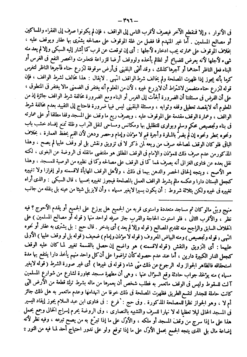لَا يُقَالُ: هَذَا مُخَالِفٌ لِشَرْطِ الْوَاقِفِ، فَإِنَّ قَوْلَهُ لِتُزْرَعَ حِنَّاءً مُتَضَمِّنٌ لِاشْتِرَاطِ أَنْ لَا يَزْرَعَ غَيْرُهُ، لِأَنَّ مِنْ الْمَعْلُومِ أَنَّهُ يُغْتَفَرُ فِي الضِّمْنِيِّ مَا لَا يُغْتَفَرُ فِي الْمَنْطُوقِ، عَلَى أَنَّ الْفَرْضَ فِي مَسْأَلَتِنَا أَنَّ الضَّرُورَةَ أَلْجَأَتْ إلَى الْغَرْسِ أَوْ الْبِنَاءِ وَمَعَ الضَّرُورَةِ مُخَالَفَةُ شَرْطِ الْوَاقِفِ جَائِزَةٌ إذْ مِنْ الْمَعْلُومِ أَنَّهُ لَا يَقْصِدُ تَعْطِيلَ وَقْفِهِ وَثَوَابِهِ، وَمَسْأَلَةُ الْبُلْقِينِيِّ لَيْسَ فِيهَا ضَرُورَةٌ فَاحْتَاجَ إلَى التَّقْيِيدِ بِعَدَمِ مُخَالَفَةِ شَرْطِ الْوَاقِفِ، وَعِمَارَةُ الْوَقْفِ مُقَدَّمَةٌ عَلَى الْمَوْقُوفِ عَلَيْهِ، وَيُصْرَفُ رِيعُ مَا وُقِفَ عَلَى الْمَسْجِدِ وَقْفًا مُطْلَقًا أَوْ عَلَى عِمَارَتِهِ فِي بِنَاءٍ وَتَجْصِيصٍ مُحْكَمٍ وَسُلَّمٍ وَبَوَارِي لِلتَّظْلِيلِ بِهَا وَمَكَانِسَ وَمَسَاحِي لِنَقْلِ التُّرَابِ وَظُلَّةٍ تَمْنَعُ إفْسَادَ خَشَبِ بَابٍ وَنَحْوِهِ بِمَطَرٍ وَنَحْوِهِ إنْ لَمْ يَضُرَّ بِالْمَارَّةِ وَأُجْرَةِ قَيِّمٍ لَا مُؤَذِّنٍ وَإِمَامٍ وَحُصْرٍ وَدُهْنٍ؛ لِأَنَّ الْقَيِّمَ يَحْفَظُ الْعِمَارَةَ، بِخِلَافِ الْبَاقِي فَلَوْ كَانَ الْوَقْفُ لِمَصَالِحِهِ صَرَفَ مِنْ رِيعِهِ لِمَنْ ذُكِرَ لَا فِي تَزْوِيقٍ وَنَقْشٍ بَلْ لَوْ وَقَفَ عَلَيْهَا لَمْ يَصِحَّ.
