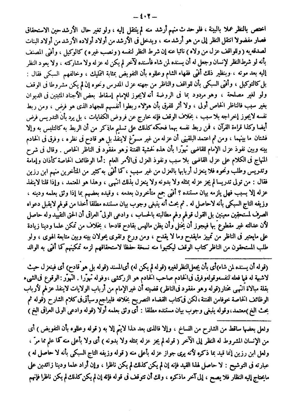 (قَوْلُهُ: وَعَلَّلُوهُ بِأَنَّ التَّفْوِيضَ) أَيْ: مِنْ الْإِنْسَانِ الْمَشْرُوطِ لَهُ النَّظَرُ إلَى الْآخَرِ. (قَوْلُهُ: لَمْ يَجُزْ عَزْلُهُ بِمِثْلِهِ وَلَا بِدُونِهِ) أَيْ: وَلَا بِأَعْلَى مِنْهُ كَمَا عُلِمَ مِمَّا مَرَّ، وَلَعَلَّ ابْنَ رَزِينٍ إنَّمَا قَيَّدَ بِمَا ذَكَرَهُ؛ لِأَنَّهُ يَرَى جَوَازَ عَزْلِهِ بِأَعْلَى مِنْهُ. (قَوْلُهُ: وَزَيَّفَهُ التَّاجُ السُّبْكِيُّ بِأَنَّهُ لَا حَاصِلَ لَهُ) عِبَارَتُهُ فِي التَّوْشِيحِ: لَا حَاصِلَ لِهَذَا الْقَيْدِ؛ فَإِنَّهُ إنْ لَمْ يَكُنْ كَذَلِكَ لَمْ يَكُنْ نَاظِرًا، وَإِنْ أَرَادَ عِلْمًا وَدِينًا زَائِدَيْنِ عَلَى مَا يَحْتَاجُ إلَيْهِ النُّظَّارُ فَلَا يَصِحُّ، إلَى آخِرِ مَا ذَكَرَهُ، وَلَك أَنْ تَتَوَقَّفَ فِي قَوْلِهِ فَإِنَّهُ إنْ لَمْ يَكُنْ كَذَلِكَ لَمْ يَكُنْ نَاظِرًا فَإِنَّهُمْ