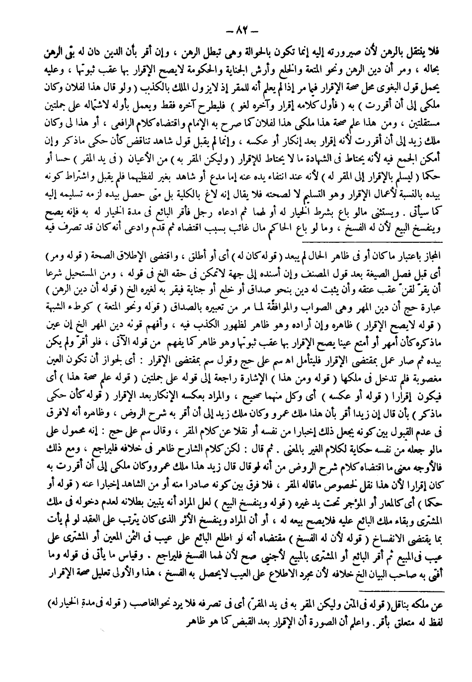 ـــــــــــــــــــــــــــــSالْمَجَازِ بِاعْتِبَارِ مَا كَانَ أَوْ فِي ظَاهِرِ الْحَالِ لَمْ يَبْعُدْ (قَوْلُهُ: كَانَ لَهُ) أَيْ أَوْ أَطْلَقَ، وَاقْتَضَى الْإِطْلَاقُ الصِّحَّةَ (قَوْلُهُ: وَمَرَّ) أَيْ قَبْلَ فَصْلِ الصِّيغَةِ بَعْدَ قَوْلِ الْمُصَنِّفِ وَإِنْ أَسْنَدَهُ إلَى جِهَةٍ لَا تُمْكِنُ فِي حَقِّهِ إلَخْ فِي قَوْلِهِ، وَمِنْ الْمُسْتَحِيلِ شَرْعًا أَنْ يُقِرَّ لِقِنٍّ عَقِبَ عِتْقِهِ وَأَنْ يَثْبُتَ لَهُ دَيْنٌ بِنَحْوِ صَدَاقٍ أَوْ خُلْعٍ أَوْ جِنَايَةٍ فَيُقِرُّ بِهِ لِغَيْرِهِ إلَخْ (قَوْلُهُ: أَنَّ دَيْنَ الرَّهْنِ) عِبَارَةُ حَجّ أَنَّ دَيْنَ الْمَهْرِ وَهِيَ الصَّوَابُ وَالْمُوَافَقَةُ لِمَا مَرَّ مِنْ تَعْبِيرِهِ بِالصَّدَاقِ (قَوْلُهُ: وَنَحْوُ الْمُتْعَةِ) كَوَطْءِ الشُّبْهَةِ (قَوْلُهُ: لَا يَصِحُّ الْإِقْرَارُ) ظَاهِرُهُ وَإِنْ أَرَادَهُ وَهُوَ ظَاهِرٌ لِظُهُورِ الْكَذِبِ فِيهِ، وَأَفْهَمَ قَوْلُهُ دَيْنُ الْمَهْرِ إلَخْ إنْ عَيَّنَ مَا ذَكَرَهُ كَأَنْ أَمْهَرَ أَوْ أَمْتَعَ عَيْنًا يَصِحُّ الْإِقْرَارُ بِهَا عَقِبَ ثُبُوتِهَا وَهُوَ ظَاهِرٌ كَمَا يُفْهَمُ مِنْ قَوْلِهِ الْآتِي، فَلَوْ أَقَرَّ وَلَمْ يَكُنْ بِيَدِهِ ثُمَّ صَارَ عَمِلَ بِمُقْتَضَى الْإِقْرَارِ فَلْيُتَأَمَّلْ اهـ سم عَلَى حَجّ وَقَوْلُ سم بِمُقْتَضَى الْإِقْرَارِ: أَيْ لِجَوَازِ أَنْ تَكُونَ الْعَيْنُ مَغْصُوبَةً فَلَمْ تَدْخُلْ فِي مِلْكِهَا (قَوْلُهُ: وَمِنْ هَذَا) الْإِشَارَةُ رَاجِعَةٌ إلَى قَوْلِهِ عَلَى جُمْلَتَيْنِ (قَوْلُهُ: عَلِمَ صِحَّةَ هَذَا) أَيْ فَيَكُونُ إقْرَارًا (قَوْلُهُ: أَوْ عَكْسُهُ) أَيْ وَكُلٌّ مِنْهُمَا صَحِيحٌ، وَالْمُرَادُ بِعَكْسِهِ الْإِنْكَارُ بَعْدَ الْإِقْرَارِ (قَوْلُهُ: كَأَنْ حَكَى مَا ذُكِرَ) بِأَنْ قَالَ: إنَّ زَيْدًا أَقَرَّ بِأَنَّ هَذَا مِلْكُ عَمْرٍو، وَكَانَ مِلْكَ زَيْدٍ إلَى أَنْ أَقَرَّ بِهِ شَرْحُ الرَّوْضِ، وَظَاهِرُهُ أَنَّهُ لَا فَرْقَ فِي عَدَمِ الْقَبُولِ بَيْنَ كَوْنِهِ يَجْعَلُ ذَلِكَ إخْبَارًا مِنْ نَفْسِهِ أَوْ نَقْلًا عَنْ كَلَامِ الْمُقِرِّ، وَقَالَ سم عَلَى حَجّ: إنَّهُ مَحْمُولٌ عَلَى مَا لَوْ جَعَلَهُ مِنْ نَفْسِهِ حِكَايَةً لِكَلَامِ الْغَيْرِ بِالْمَعْنَى. ثُمَّ قَالَ: لَكِنَّ كَلَامَ الشَّارِحِ ظَاهِرٌ فِي خِلَافِهِ فَلْيُرَاجَعْ، وَمَعَ ذَلِكَ فَالْأَوْجَهُ مَعْنَى مَا اقْتَضَاهُ كَلَامُ شَرْحِ الرَّوْضِ مِنْ أَنَّهُ لَوْ قَالَ قَالَ زَيْدٌ هَذَا مِلْكُ عَمْرٍو وَكَانَ مِلْكِي إلَى أَنْ أَقْرَرْت بِهِ كَانَ إقْرَارًا لِأَنَّ هَذَا نَقْلٌ لِخُصُوصِ مَا قَالَهُ الْمُقِرُّ، فَلَا فَرْقَ بَيْنَ كَوْنِهِ صَادِرًا مِنْهُ أَوْ مِنْ الشَّاهِدِ إخْبَارًا عَنْهُ (قَوْلُهُ: أَوْ حُكْمًا) أَيْ كَالْمُعَارِ أَوْ الْمُؤَجَّرِ تَحْتَ يَدِ غَيْرِهِ (قَوْلُهُ: وَيَنْفَسِخُ الْبَيْعُ) لَعَلَّ الْمُرَادَ أَنَّهُ يَتَبَيَّنُ بُطْلَانُهُ لِعَدَمِ دُخُولِهِ فِي مِلْكِ الْمُشْتَرِي وَبَقَاءِ مِلْكِ الْبَائِعِ عَلَيْهِ فَلَا يَصِحُّ بَيْعُهُ لَهُ، أَوْ أَنَّ الْمُرَادَ وَيَنْفَسِخُ الْأَثَرُ الَّذِي كَانَ يَتَرَتَّبُ عَلَى الْعَقْدِ لَوْ لَمْ يَأْتِ بِمَا يَقْتَضِي الِانْفِسَاخَ (قَوْلُهُ: لِأَنَّ لَهُ الْفَسْخَ) مُقْتَضَاهُ أَنَّهُ لَوْ اطَّلَعَ الْبَائِعُ عَلَى عَيْبٍ فِي الثَّمَنِ الْمُعَيَّنِ أَوْ الْمُشْتَرِي عَلَى عَيْبٍ فِي الْمَبِيعِ ثُمَّ أَقَرَّ الْبَائِعُ أَوْ الْمُشْتَرِي بِالْمَبِيعِ لِأَجْنَبِيٍّ صَحَّ لِأَنَّ لَهُمَا الْفَسْخَ فَلْيُرَاجَعْ، وَقِيَاسُ مَا يَأْتِي فِي قَوْلِهِ وَمَا أَفْتَى بِهِ صَاحِبُ الْبَيَانِ إلَخْ خِلَافُهُ لِأَنَّ مُجَرَّدَ الِاطِّلَاعِ عَلَى الْعَيْبِ لَا يَحْصُلُ بِهِ الْفَسْخُ، وَهَذَا وَا