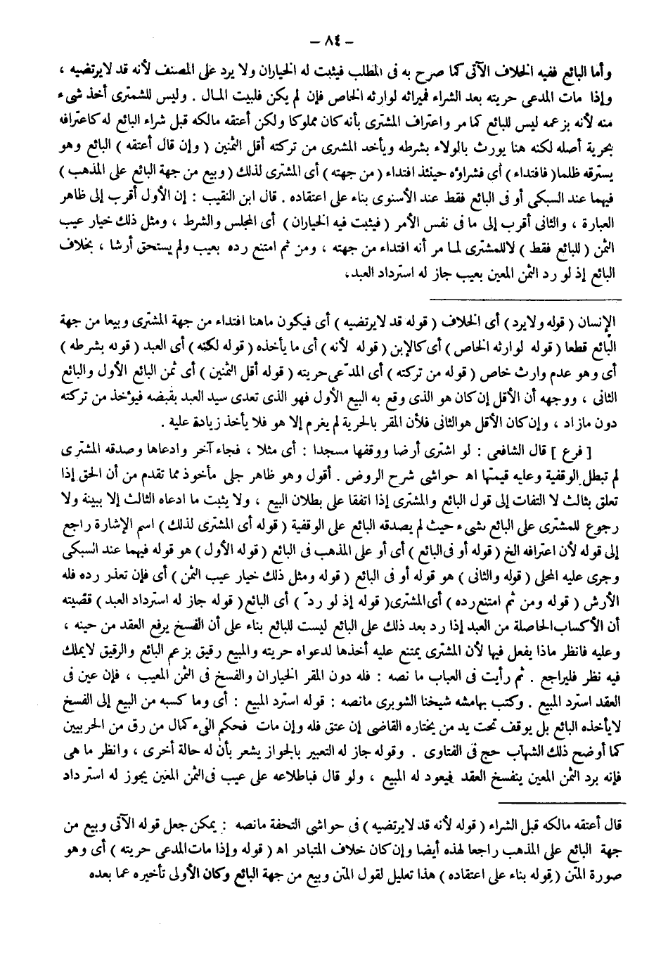 ثُمَّ رَأَيْت فِي الْعُبَابِ مَا نَصُّهُ: فَلَهُ دُونَ الْمُقِرِّ الْخِيَارَانِ وَالْفَسْخُ فِي الثَّمَنِ الْمَعِيبِ، فَإِنْ عَيَّنَ فِي الْعَقْدِ اسْتَرَدَّ الْمَبِيعَ. وَكَتَبَ بِهَامِشِهِ شَيْخُنَا الشَّوْبَرِيُّ مَا نَصُّهُ: قَوْلُهُ اسْتَرَدَّ الْمَبِيعَ: أَيْ وَمَا كَسَبَهُ مِنْ الْبَيْعِ إلَى الْفَسْخِ لَا يَأْخُذُهُ الْبَائِعُ بَلْ يُوقَفُ تَحْتَ يَدِ مَنْ يَخْتَارُهُ الْقَاضِي إنْ عَتَقَ فَلَهُ وَإِنْ مَاتَ فَحُكْمُ الْفَيْءِ كَمَالٍ مِنْ رِقٍّ مِنْ الْحَرْبِيِّينَ كَمَا أَوْضَحَ ذَلِكَ الشِّهَابُ حَجّ فِي الْفَتَاوَى. وَقَوْلُهُ: جَازَ لَهُ التَّعْبِيرُ بِالْجَوَازِ يُشْعِرُ بِأَنَّ لَهُ حَالَةً أُخْرَى، وَانْظُرْ مَا هِيَ فَإِنَّهُ بِرَدِّ الثَّمَنِ الْمُعَيَّنِ يَنْفَسِخُ الْعَقْدُ فَيَعُودُ لَهُ الْمَبِيعُ، وَلَوْ قَالَ فَبِاطِّلَاعِهِ عَلَى عَيْبٍ فِي الثَّمَنِ الْمُعَيَّنِ يَجُوزُ لَهُ اسْتِرْدَادُ