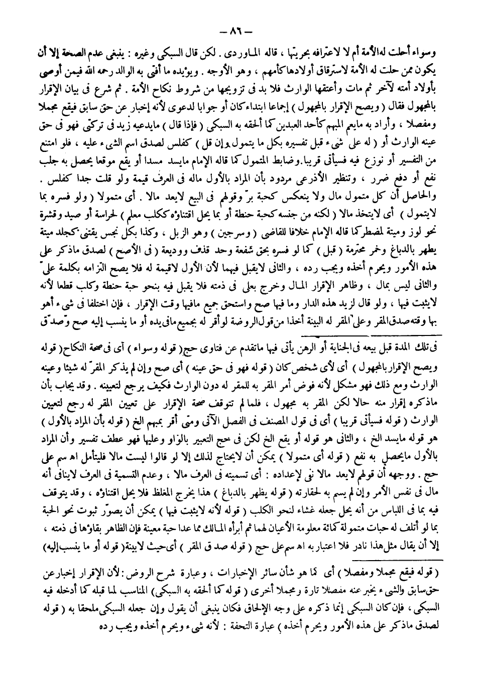 ثُمَّ شَرَعَ فِي بَيَانِ الْإِقْرَارِ بِالْمَجْهُولِ فَقَالَ (وَيَصِحُّ) (الْإِقْرَارُ بِالْمَجْهُولِ) إجْمَاعًا ابْتِدَاءً كَانَ أَوْ جَوَابًا لِدَعْوَى لِأَنَّهُ إخْبَارٌ عَنْ حَقٍّ سَابِقٍ فَيَقَعُ مُجْمَلًا وَمُفَصَّلًا، وَأَرَادَ بِهِ مَا يَعُمَّ الْمُبْهَمَ كَأَحَدِ الْعَبْدَيْنِ كَمَا أَلْحَقَهُ بِهِ السُّبْكِيُّ (فَإِذَا) (قَالَ) مَا يَدَّعِيه زَيْدٌ فِي تَرِكَتِي فَهُوَ فِي حَقٍّ عَيَّنَهُ الْوَارِثُ أَوْ (لَهُ عَلَيَّ شَيْءٌ قُبِلَ تَفْسِيرُهُ بِكُلِّ مَا يُتَمَوَّلُ وَإِنْ قَلَّ) كَفَلْسٍ لِصِدْقِ اسْمِ الشَّيْءِ عَلَيْهِ، فَلَوْ امْتَنَعَ مِنْ التَّفْسِيرِ أَوْ نُوزِعَ فِيهِ فَسَيَأْتِي قَرِيبًا.