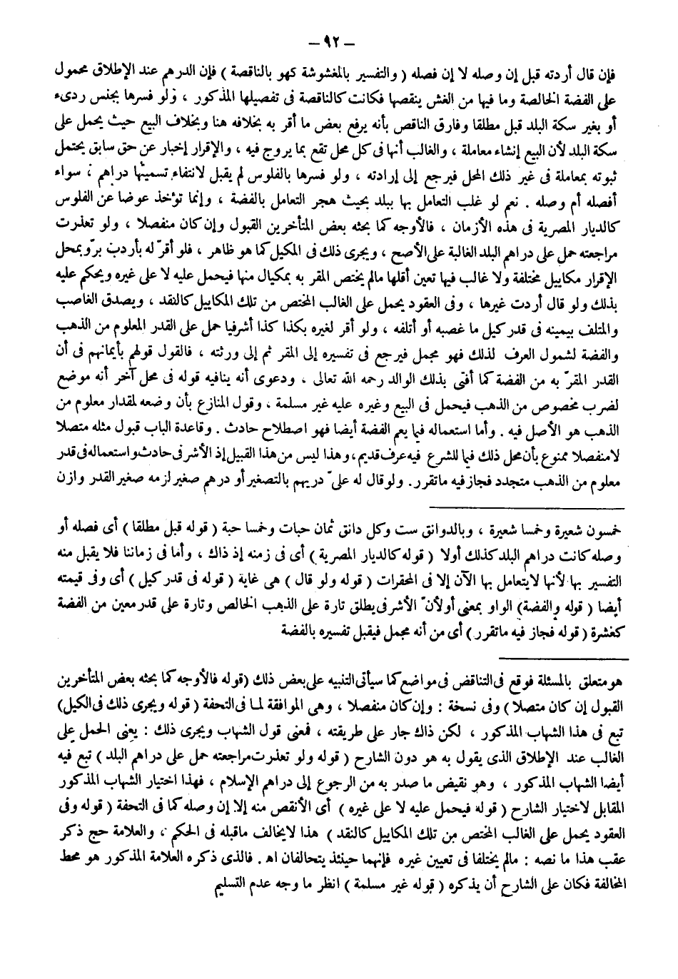 نَعَمْ لَوْ غَلَبَ التَّعَامُلُ بِهَا بِبَلَدٍ بِحَيْثُ هُجِرَ التَّعَامُلُ بِالْفِضَّةِ، وَإِنَّمَا تُؤْخَذُ عِوَضًا عَنْ الْفُلُوسِ كَالدِّيَارِ الْمِصْرِيَّةِ فِي هَذِهِ الْأَزْمَانِ، فَالْأَوْجَهُ كَمَا بَحَثَهُ بَعْضُ الْمُتَأَخِّرِينَ الْقَبُولُ وَإِنْ كَانَ مُنْفَصِلًا، وَلَوْ تَعَذَّرَتْ مُرَاجَعَتُهُ حُمِلَ عَلَى دَرَاهِمِ الْبَلَدِ الْغَالِبَةِ عَلَى الْأَصَحِّ، وَيَجْرِي ذَلِكَ فِي الْمَكِيلِ كَمَا هُوَ ظَاهِرٌ، فَلَوْ أَقَرَّ لَهُ بِإِرْدَبِّ بُرٍّ وَبِمَحَلِّ الْإِقْرَارِ مَكَايِيلُ مُخْتَلِفَةٌ وَلَا غَالِبَ فِيهَا تَعَيَّنَ أَقَلُّهَا مَا لَمْ يَخْتَصَّ الْمُقَرُّ بِهِ بِمِكْيَالٍ مِنْهَا فَيُحْمَلُ عَلَيْهِ لَا عَلَى غَيْرِهِ وَيُحْكَمُ عَلَيْهِ بِذَلِكَ وَلَوْ قَالَ: أَرَدْت غَيْرَهَا، وَفِي الْعُقُودِ يُحْمَلُ عَلَى الْغَالِبِ الْمُخْتَصِّ مِنْ تِلْكَ الْمَكَايِيلِ كَالنَّقْدِ، وَيُصَدَّقُ الْغَاصِبُ وَالْمُتْلِفُ بِيَمِينِهِ فِي قَدْرِ كَيْلِ مَا غَصَبَهُ أَوْ أَتْلَفَهُ، وَلَوْ أَقَرَّ لِغَيْرِهِ بِكَذَا كَذَا أَشَرَفِيًّا حُمِلَ عَلَى الْقَدْرِ الْمَعْلُومِ مِنْ الذَّهَبِ وَالْفِضَّةِ لِشُمُولِ الْعُرْفِ لِذَلِكَ فَهُوَ مُجْمَلٌ فَيُرْجَعُ فِي تَفْسِيرِهِ إلَى الْمُقِرِّ ثُمَّ إلَى وَرَثَتِهِ، فَالْقَوْلُ قَوْلُهُمْ بِأَيْمَانِهِمْ فِي أَنَّ الْقَدْرَ الْمُقَرَّ بِهِ مِنْ الْفِضَّةِ كَمَا أَفْتَى بِذَلِكَ الْوَالِدُ - رَحِمَهُ اللَّهُ تَعَالَى -، وَدَعْوَى أَنَّهُ يُنَافِيه قَوْلُهُ فِي مَحَلٍّ آخَرَ أَنَّهُ مَوْضِعٌ لِضَرْبٍ مَخْصُوصٍ مِنْ الذَّهَبِ فَيُحْمَلُ فِي الْبَيْعِ وَغَيْرِهِ عَلَيْهِ غَيْرُ مُسَلَّمَةٍ، وَقَوْلُ الْمُنَازِعِ بِأَنْ وَضَعَهُ لِمِقْدَارٍ مَعْلُومٍ مِنْ الذَّهَبِ هُوَ الْأَصْلُ فِيهِ.