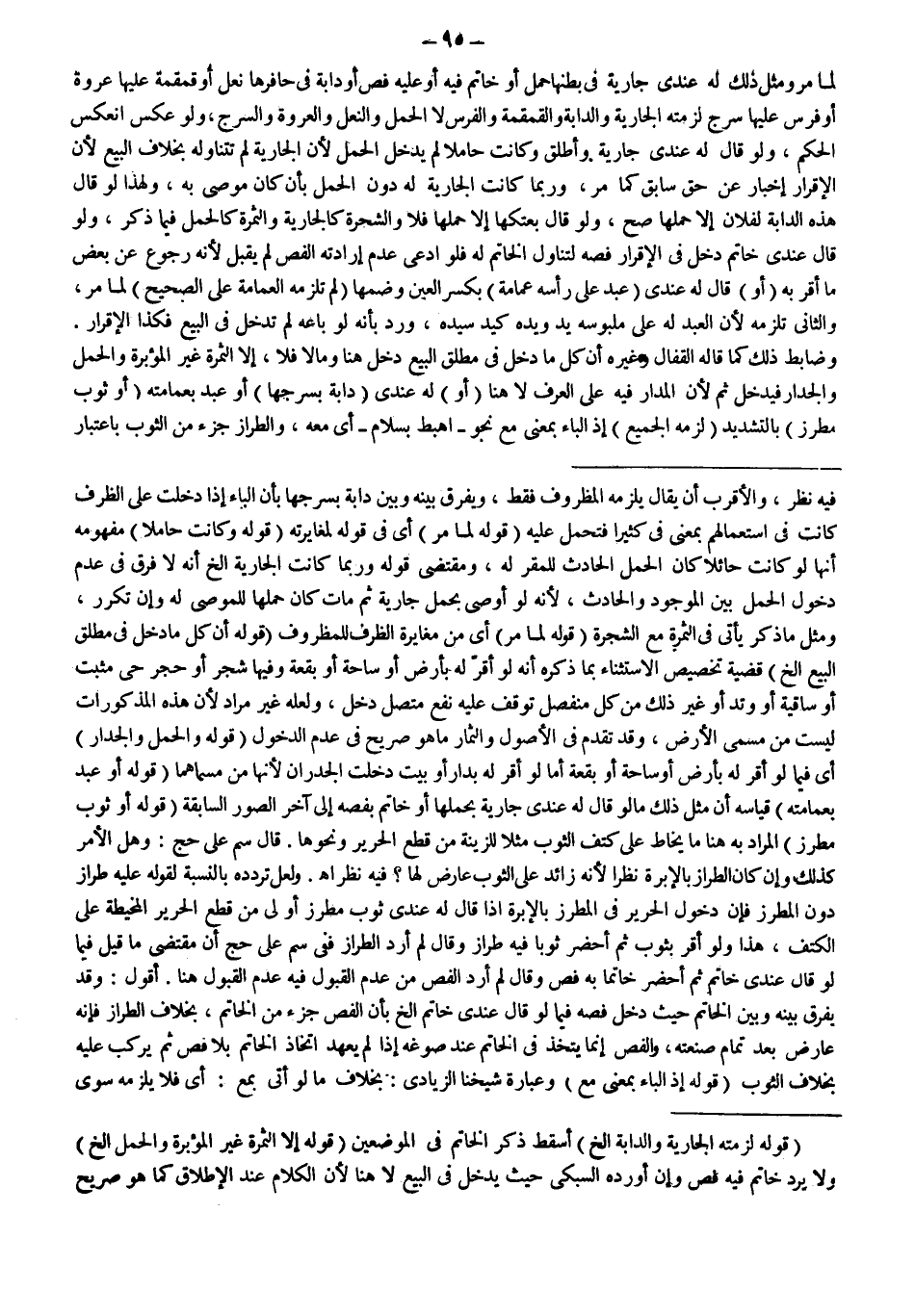 ـــــــــــــــــــــــــــــSفِيهِ نَظَرٌ، وَالْأَقْرَبُ أَنْ يُقَالَ يَلْزَمُهُ الْمَظْرُوفُ فَقَطْ، وَيُفَرَّقُ بَيْنَهُ وَبَيْنَ دَابَّةٍ بِسَرْجِهَا بِأَنَّ الْبَاءَ إذَا دَخَلَتْ عَلَى الظَّرْفِ كَانَتْ فِي اسْتِعْمَالِهِمْ بِمَعْنَى فِي كَثِيرًا فَتُحْمَلُ عَلَيْهِ (قَوْلُهُ: لِمَا مَرَّ) أَيْ فِي قَوْلِهِ لِمُغَايَرَتِهِ (قَوْلُهُ: وَكَانَتْ حَامِلًا) مَفْهُومُهُ أَنَّهَا لَوْ كَانَتْ حَائِلًا كَانَ الْحَمْلُ الْحَادِثُ لِلْمُقَرِّ لَهُ، وَمُقْتَضَى قَوْلِهِ وَرُبَّمَا كَانَتْ الْجَارِيَةُ إلَخْ أَنَّهُ لَا فَرْقَ فِي عَدَمِ دُخُولِ الْحَمْلِ بَيْنَ الْمَوْجُودِ وَالْحَادِثِ؛ لِأَنَّهُ لَوْ أَوْصَى بِحَمْلِ جَارِيَةٍ ثُمَّ مَاتَ كَانَ حَمْلُهَا لِلْمُوصَى لَهُ وَإِنْ تَكَرَّرَ، مِثْلُ مَا ذُكِرَ يَأْتِي فِي الثَّمَرَةِ مَعَ الشَّجَرَةِ (قَوْلُهُ: لِمَا مَرَّ) أَيْ مِنْ مُغَايَرَةِ الظَّرْفِ لِلْمَظْرُوفِ (قَوْلُهُ: أَنَّ كُلَّ مَا دَخَلَ فِي مُطْلَقِ الْبَيْعِ إلَخْ) قَضِيَّةُ تَخْصِيصِ الِاسْتِثْنَاءِ بِمَا ذَكَرَهُ أَنَّهُ لَوْ أَقَرَّ لَهُ بِأَرْضٍ أَوْ سَاحَةٍ أَوْ بُقْعَةٍ وَفِيهَا شَجَرٌ أَوْ حَجَرٌ حَيٌّ مُثْبَتٌ أَوْ سَاقِيَّةٌ أَوْ وَتَدٌ أَوْ غَيْرُ ذَلِكَ مِنْ كُلِّ مُنْفَصِلٍ تَوَقَّفَ عَلَيْهِ نَفْعٌ مُتَّصِلٌ دَخَلَ، وَلَعَلَّهُ غَيْرُ مُرَادٍ لِأَنَّ هَذِهِ الْمَذْكُورَاتِ لَيْسَتْ مِنْ مُسَمَّى الْأَرْضِ، وَقَدْ تَقَدَّمَ فِي الْأُصُولِ وَالثِّمَارِ مَا هُوَ صَرِيحٌ فِي عَدَمِ الدُّخُولِ (قَوْلُهُ: وَالْحَمْلُ وَالْجِدَارُ) أَيْ فِيمَا لَوْ أَقَرَّ لَهُ بِأَرْضٍ أَوْ سَاحَةٍ أَوْ بُقْعَةٍ أَمَّا لَوْ أَقَرَّ لَهُ بِدَارٍ أَوْ بَيْتٍ دَخَلَتْ الْجُدْرَانُ لِأَنَّهَا مِنْ مُسَمَّاهُمَا (قَوْلُهُ: أَوْ عَبْدٌ بِعِمَامَتِهِ) قِيَاسُهُ أَنَّ مِثْلَ ذَلِكَ مَا لَوْ قَالَ لَهُ عِنْدِي جَارِيَةٌ بِحَمْلِهَا أَوْ خَاتَمٌ بِفَصِّهِ إلَى آخِرِ الصُّوَرِ السَّابِقَةِ (قَوْلُهُ: أَوْ ثَوْبٌ مُطَرَّزٌ) الْمُرَادُ بِهِ هُنَا مَا يُخَاطُ عَلَى كَتِفِ الثَّوْبِ مَثَلًا لِلزِّينَةِ مِنْ قِطَعِ الْحَرِيرِ وَنَحْوِهَا.