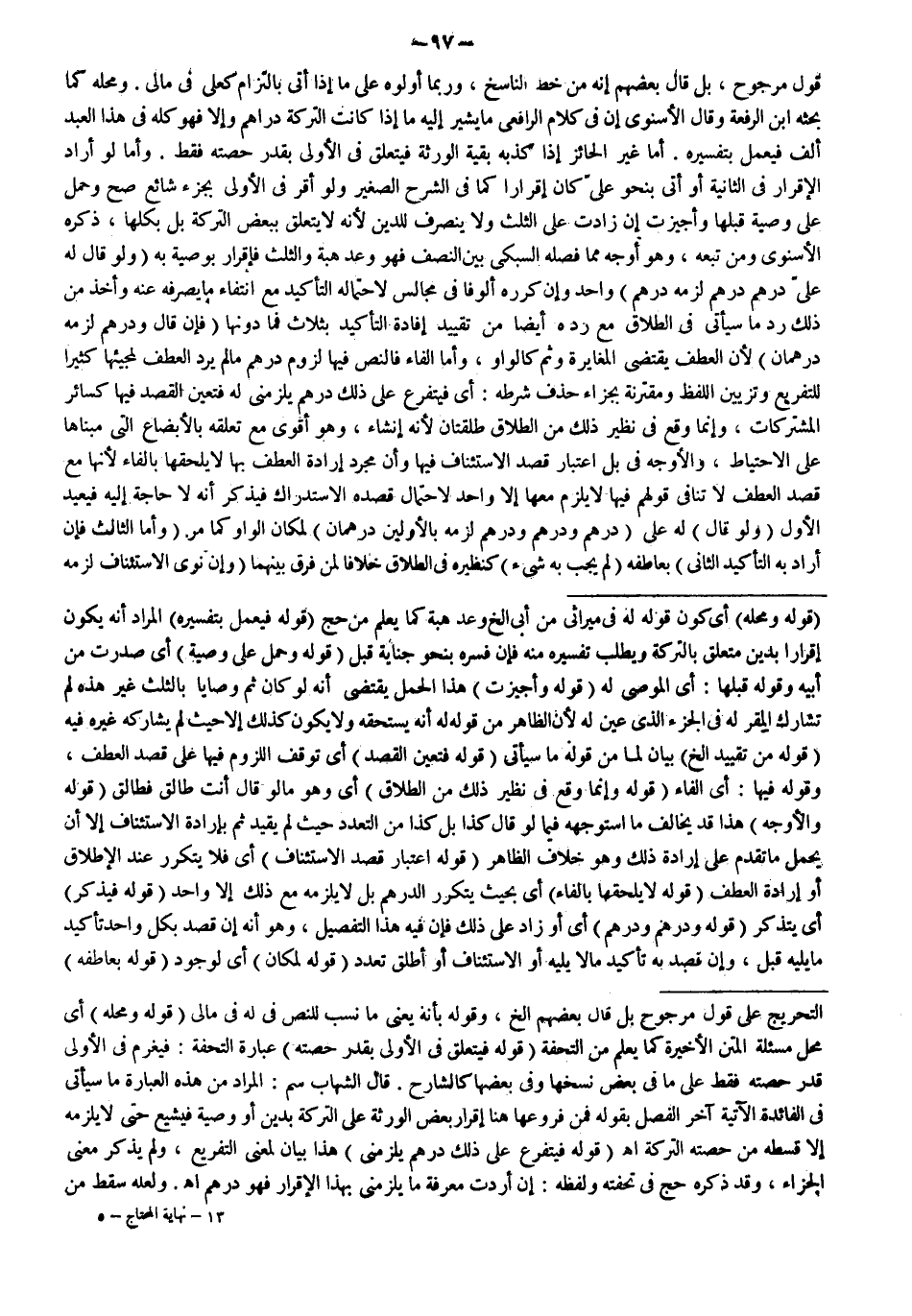 وَأَمَّا لَوْ أَرَادَ الْإِقْرَارَ فِي الثَّانِيَةِ أَوْ أَتَى بِنَحْوِ عَلِيَّ كَانَ إقْرَارًا كَمَا فِي الشَّرْحَ الصَّغِيرِ وَلَوْ أَقَرَّ فِي الْأُولَى بِجُزْءٍ شَائِعٍ صَحَّ وَحُمِلَ عَلَى وَصِيَّةٍ قِبَلَهَا وَأُجِيزَتْ إنْ زَادَتْ عَلَى الثُّلُثِ وَلَا يَنْصَرِفُ لِلدَّيْنِ لِأَنَّهُ لَا يَتَعَلَّقُ بِبَعْضِ التَّرِكَةِ بَلْ بِكُلِّهَا، ذَكَرَهُ الْإِسْنَوِيُّ وَمَنْ تَبِعَهُ، وَهُوَ أَوْجَهُ مِمَّا فَصَلَهُ السُّبْكِيُّ بَيْنَ النِّصْفِ فَهُوَ وَعْدُ هِبَةٍ وَالثُّلُثُ فَإِقْرَارٌ بِوَصِيَّةِ بِهِ.