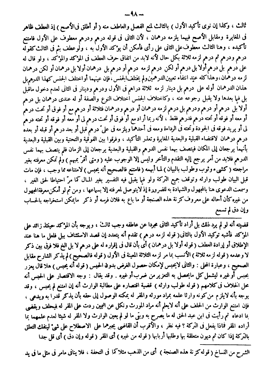 وَقَدْ يُقَالُ: وَجْهُ الِاقْتِصَارِ عَلَى الْحَبْسِ أَنَّهُ مَحَلُّ الْخِلَافِ فِي كَلَامِهِمْ (قَوْلُهُ: طُولِبَ وَارِثُهُ) قَضِيَّةُ اقْتِصَارِهِ عَلَى مُطَالَبَةِ الْوَارِثِ أَنَّهُ إنْ امْتَنَعَ لَمْ يُحْبَسْ، وَقَدْ يُوَجَّهُ بِأَنَّهُ لَا يَلْزَمُ مِنْ كَوْنِهِ وَارِثًا عِلْمُهُ بِمُرَادِ مُوَرِّثِهِ وَالْمُقَرُّ لَهُ يُمْكِنُهُ الْوُصُولُ إلَى حَقِّهِ بِأَنْ يَذْكُرَ قَدْرًا بِهِ وَيَدَّعِي، فَإِنْ امْتَنَعَ الْوَارِثُ مِنْ الْحَلِفِ عَلَى أَنَّهُ لَا يَعْلَمُ أَنَّهُ مُرَادُ الْمُوَرِّثِ وَنَكَلَ عَنْ الْيَمِينِ رُدَّتْ عَلَى الْمُقَرِّ لَهُ فَيَحْلِفُ وَيَقْضِي بِمَا ادَّعَاهُ ثُمَّ رَأَيْت فِي ابْنِ عَبْدِ الْحَقِّ لَهُ مَا يُصَرِّحُ بِهِ وَبَقِيَ مَا لَوْ لَمْ يُعَيِّنْ الْوَارِثُ وَلَا الْمُقَرُّ لَهُ شَيْئًا لِعَدَمِ عِلْمِهِمَا بِمَا أَرَادَهُ الْمُقِرُّ فَمَاذَا يُفْعَلُ فِي التَّرِكَةِ؟ فِيهِ نَظَرٌ، وَالْأَقْرَبُ أَنَّ الْقَاضِيَ يَجْبُرُهُمَا عَلَى الِاصْطِلَاحِ عَلَى شَيْءٍ لِيَنْفَكَّ التَّعَلُّقُ بِالتَّرِكَةِ إذَا كَانَ ثَمَّ دُيُونٌ مُتَعَلِّقَةٌ بِهَا وَطَلَبَهَا أَرْبَابُهَا (قَوْلُهُ: مِنْ غَيْرِهِ) أَيْ الْمُقِرِّ (قَوْلُهُ: وَإِنْ دَقَّ) أَيْ قَلَّ جِدًّا