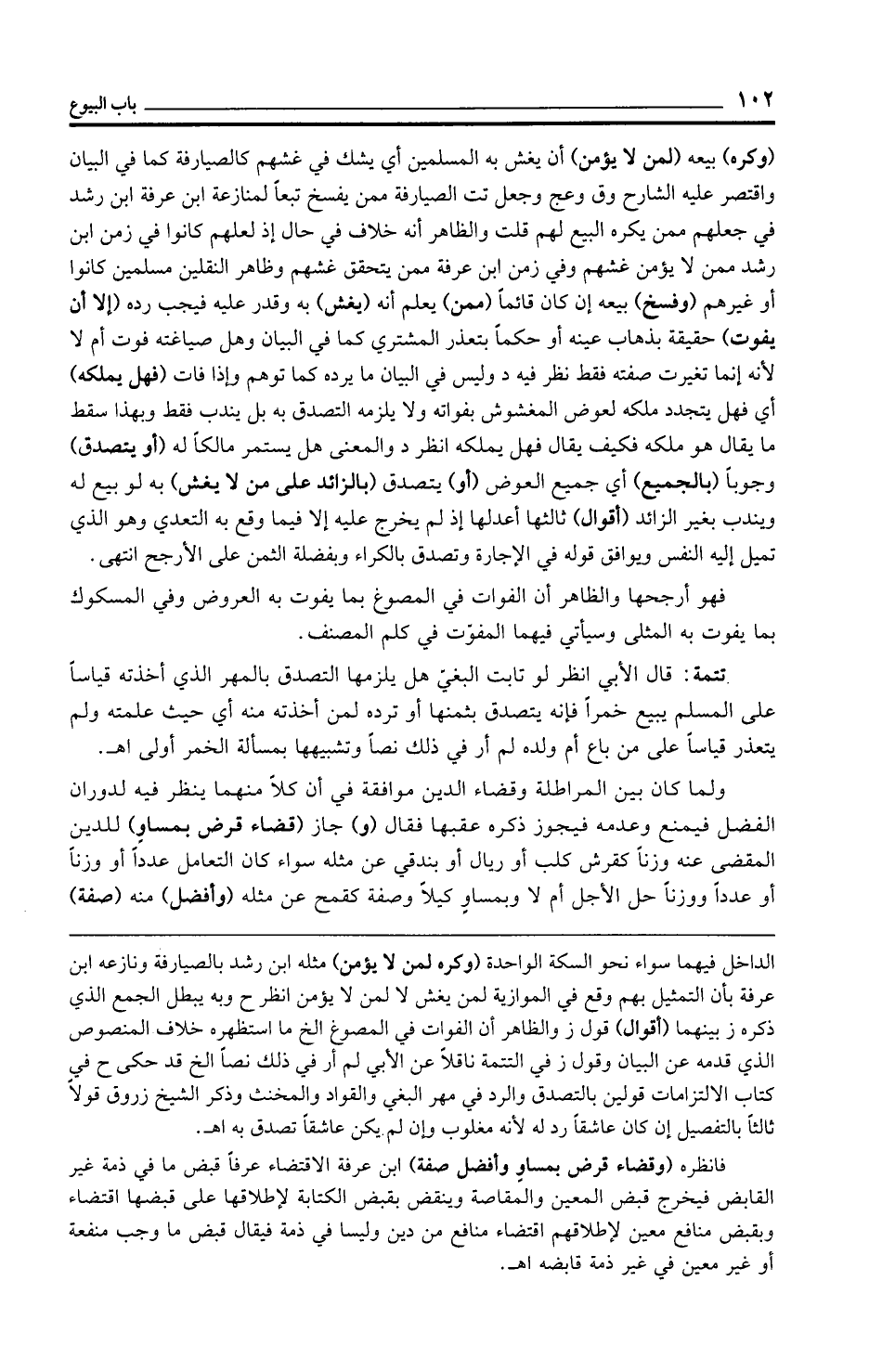 الداخل فيهما سواء نحو السكة الواحدة (وكره لمن لا يؤمن) مثله ابن رشد بالصيارفة ونازعه ابن عرفة بأن التمثيل بهم وقع في الموازية لمن يغش لا لمن لا يؤمن انظر ح وبه يبطل الجمع الذي ذكره ز بينهما (أقوال) قول ز والظاهر أن الفوات في المصوغ الخ ما استظهره خلاف المنصوص الذي قدمه عن البيان وقول ز في التتمة ناقلًا عن الأبي لم أر في ذلك نصًّا الخ قد حكى ح في كتاب الالتزامات قولين بالتصدق والرد في مهر البغي والقواد والمخنث وذكر الشيخ زروق قولًا ثالثًا بالتفصيل إن كان عاشقًا رد له لأنه مغلوب وإن لم يكن عاشقًا تصدق به اهـ.