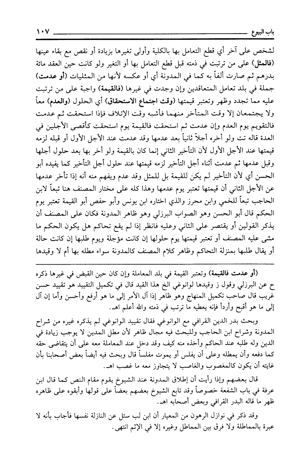 (أو عدمت فالقيمة) وتعتبر القيمة في بلد المعاملة وإن كان حين القبض في غيرها ذكره ح عن البرزلي وقول ز وقيدها لوانوغي الخ هذا القيد قال في تكميل التقييد هو تقييد حسن غريب قال صاحب تكميل المنهاج وهو ظاهر إذا آل الأمر إلى ما هو أرفع وأحسن وأما إن آل إلى ما هو أقبح وأردأ فإنه يعطيه ما ترتب في ذمته والله أعلم اهـ.