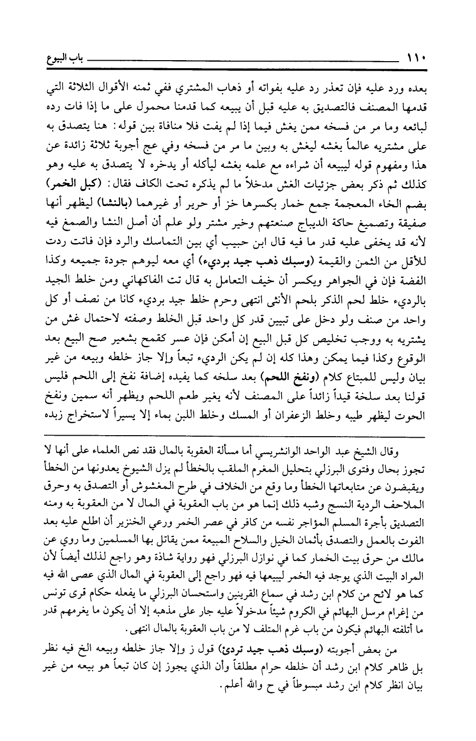 من بعض أجوبته (وسبك ذهب جيد تردئ) قول ز وإلا جاز خلطه وبيعه الخ فيه نظر بل ظاهر كلام ابن رشد أن خلطه حرام مطلقًا وأن الذي يجوز إن كان تبعًا هو بيعه من غير بيان انظر كلام ابن رشد مبسوطًا في ح والله أعلم.