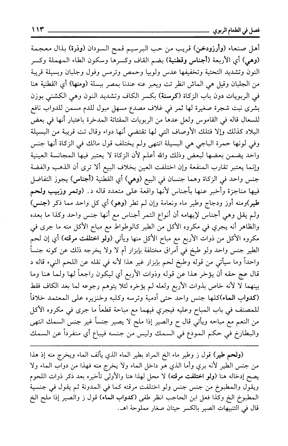 (ولحم طير) قول ز وطير ماء الخ المراد بطير الماء الذي يألف الماء ويخرج منه إذ هذا من جنس الطير لأنه بري وأما الذي هو داخل الماء ولا يخرج منه فهذا من دواب الماء ولا يصح إدخاله هنا (ولو اختلفت مرقته) لا محل لهذا هنا والأولى تأخيره بعد ذكر ذوات اللحوم ويقول والمطبوخ من جنس جنس ولو اختلفت مرقته كما في المدونة ثم يقول في جنسية المطبوخ الخ وكذا فعل ابن الحاجب انظر طفى (كدواب الماء) قول ز والصير إذا ملح الخ قال في التنبيهات الضمير بالكسر حيتان صغار مملوحة اهـ.
