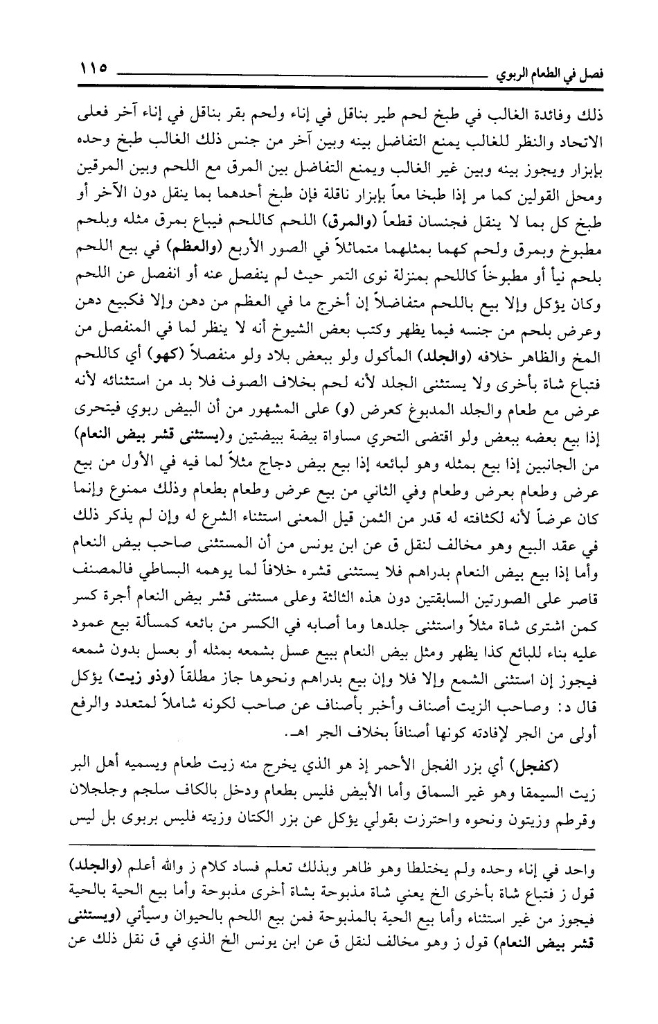 ذلك وفائدة الغالب في طبخ لحم طير بناقل في إناء ولحم بقر بناقل في إناء آخر فعلى الاتحاد والنظر للغالب يمنع التفاضل بينه وبين آخر من جنس ذلك الغالب طبخ وحده بإبزار ويجوز بينه وبين غير الغالب ويمنع التفاضل بين المرق مع اللحم وبين المرقين ومحل القولين كما مر إذا طبخا معًا بإبزار ناقلة فإن طبخ أحدهما بما ينقل دون الآخر أو طبخ كل بما لا ينقل فجنسان قطعًا (والمرق) اللحم كاللحم فيباع بمرق مثله وبلحم مطبوخ وبمرق ولحم كهما بمثلهما متماثلًا في الصور الأربع (والعظم) في بيع اللحم بلحم نيأ أو مطبوخًا كاللحم بمنزلة نوى التمر حيث لم ينفصل عنه أو انفصل عن اللحم وكان يؤكل وإلا بيع باللحم متفاضلًا إن أخرج ما في العظم من دهن وإلا فكبيع دهن وعرض بلحم من جنسه فيما يظهر وكتب بعض الشيوخ أنه لا ينظر لما في المنفصل من المخ والظاهر خلافه (والجلد) المأكول ولو ببعض بلاد ولو منفصلًا (كهو) أي كاللحم فتباع شاة بأخرى ولا يستثنى الجلد لأنه لحم بخلاف الصوف فلا بد من استثنائه لأنه عرض مع طعام والجلد المدبوغ كعرض (و) على المشهور من أن البيض ربوي فيتحرى إذا بيع بعضه ببعض ولو اقتضى التحري مساواة بيضة ببيضتين و (يستثنى قشر بيض النعام) من الجانبين إذا بيع بمثله وهو لبائعه إذا بيع بيض دجاج مثلًا لما فيه في الأول من بيع عرض وطعام بعرض وطعام وفي الثاني من بيع عرض وطعام بطعام وذلك ممنوع وإنما كان عرضًا لأنه لكثافته له قدر من الثمن قيل المعنى استثناء الشرع له وإن لم يذكر ذلك في عقد البيع وهو مخالف لنقل ق عن ابن يونس من أن المستثنى صاحب بيض النعام وأما إذا بيع بيض النعام بدراهم فلا يستثنى قشره خلافًا لما يوهمه البساطي فالمصنف قاصر على الصورتين السابقتين دون هذه الثالثة وعلى مستثنى قشر بيض النعام أجرة كسر كمن اشترى شاة مثلًا واستثنى جلدها وما أصابه في الكسر من بائعه كمسألة بيع عمود عليه بناء للبائع كذا يظهر ومثل بيض النعام ببيع عسل بشمعه بمثله أو بعسل بدون شمعه فيجوز إن استثنى السمع وإلا فلا وإن بيع بدراهم ونحوها جاز مطلقًا (وذو زيت) يؤكل قال د: وصاحب الزيت أصناف وأخبر بأصناف عن صاحب لكونه شاملًا لمتعدد والرفع أولى من الجر لإفادته كونها أصنافًا بخلاف الجر اهـ.