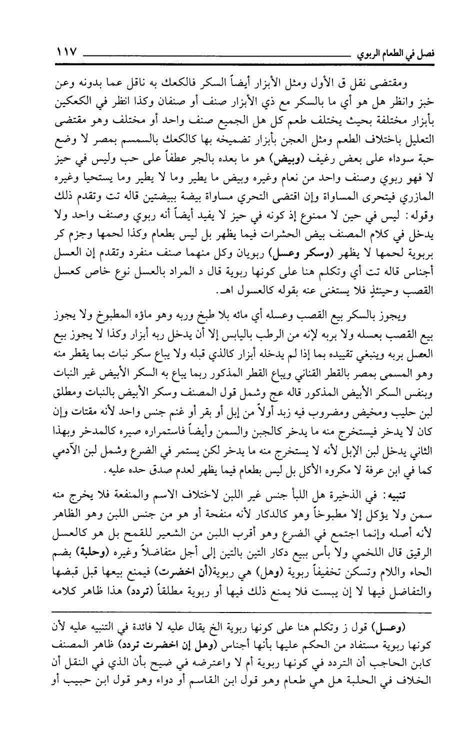 ومقتضى نقل ق الأول ومثل الأبزار أيضًا السكر فالكعك به ناقل عما بدونه وعن خبز وانظر هل هو أي ما بالسكر مع ذي الأبزار صنف أو صنفان وكذا انظر في الكعكين بأبزار مختلفة بحيث يختلف طعم كل هل الجميع صنف واحد أو مختلف وهو مقتضى التعليل باختلاف الطعم ومثل العجين بأبزار تضميخه بها كالكعك بالسمسم بمصر لا وضع حبَّة سوداء على بعض رغيف (وبيض) هو ما بعده بالجر عطفًا على حب وليس في حيز لا فهو ربوي وصنف واحد من نعام وغيره وبيض ما يطير وما لا يطير وما يستحيا وغيره المازري فيتحرى المساواة وإن اقتضى التحري مساواة بيضة ببيضتين قاله تت وتقدم ذلك وقوله: ليس في حين لا ممنوع إذ كونه في حيز لا يفيد أيضًا أنه ربوي وصنف واحد ولا يدخل في كلام المصنف بيض الحشرات فيما يظهر بل ليس بطعام وكذا لحمها وجزم كر بربوية لحمها لا يظهر (وسكر وعسل) ربويان وكل منهما صنف منفرد وتقدم إن العسل أجناس قاله تت أي وتكلم هنا على كونها ربوية قال د المراد بالعسل نوع خاص كعسل القصب وحينئذٍ فلا يستغنى عنه بقوله كالعسول اهـ.