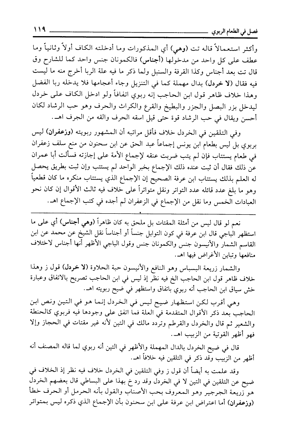 والشمار زريعة البسباس وهو النافع والأنيسون حبَّة الحلاوة (لا خردل) قول ز وهذا خلاف ظاهر قول ابن الحاجب الخ فيه نظر إذ ليس في ابن الحاجب تصريح بالاتفاق وعبارة خش سياق ابن الحاجب أنه ربوي باتفاق واستظهر في ضيح ربويته اهـ.