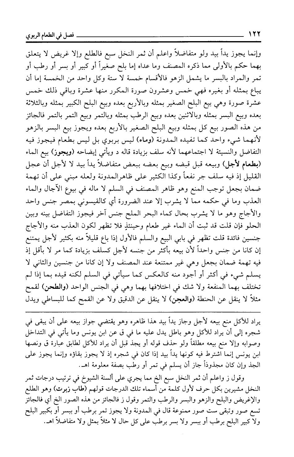 وإنما يجوز يدًا بيد ولو متفاضلًا واعلم أن ثمر النخل سبع فالطلع وإلا غريض لا يتعلق بهما حكم بالأولى مما ذكره المصنف وما عداه إما بلح صغيرًا أو كبير أو بسر أو رطب أو تمر والمراد بالبسر ما يشمل الزهو فالأقسام خمسة لا ستة وكل واحد من الخمسة إما أن يباع بمثله أو بغيره فهي خمس وعشرون صورة المكرر منها عشرة وباقي ذلك خمس عشرة صورة وهي بيع البلح الصغير بمثله وبالأربع بعده وبيع البلح الكبير بمثله وبالثلاثة بعده وبيع البسر بمثله وبالاثنين بعده وبيع الرطب بمثله وبالتمر وبيع التمر بالتمر فالجائز من هذه الصور بيع كل بمثله وبيع البلح الصغير بالأربع بعده ويجوز بيع البسر بالزهو لأنهما شيء واحد كما تفيده المدونة (وماء) ليس بربوي بل ليس بطعام فيجوز فيه التفاضل والنسيئة لا اجتماعهما لأنه سلف بزيادة قاله د ويأتي إيضاحه (ويجوز) بيع الماء (بطعام لأجل) وبيعه قبل قبضه وبيع بعضه ببعض متفاضلًا يدًا بيد لا لأجل أن عجل القليل إذ فيه سلف جر نفعًا وكذا الكثير على ظاهر المدونة ولعله مبني على أن تهمة ضمان بجعل توجب المنع وهو ظاهر المصنف في السلم لا ماله في بيوع الآجال والماء العذب وما في حكمه مما لا يشرب إلا عند الضرورة أي كالقيسوني بمصر جنس واحد والأجاج وهو ما لا يشرب بحال كماء البحر الملح جنس آخر فيجوز التفاضل بينه وبين الحلو فإن قلت قد ثبت أن الماء غير طعام وحينئذٍ فلا تظهر لكون العذب منه والأجاج جنسين فائدة قلت تظهر في بابي البيع والسلم فالأول إذا باع قليلًا منه بكثير لأجل يمتنع إن كانا من جنس واحدًا لأن بيعه بأكثر من جنسه لأجل كسلف بزيادة كما مر لا بأقل إذ فيه تهمة ضمان بجعل وهي غير ممتنعة عند المصنف ولا إن كانا من جنسين والثاني لا يسلم شيء في أكثر أو أجود منه كالعكس كما سيأتي في السلم لكنه قيده بما إذا لم تختلف بهما المنفعة ولا شك في اختلافها بهما وهي في الجنس الواحد (والطحن) لقمح مثلًا لا ينقل عن الحنطة (والعجن) لا ينقل عن الدقيق ولا عن القمح كما للبساطي ويدل