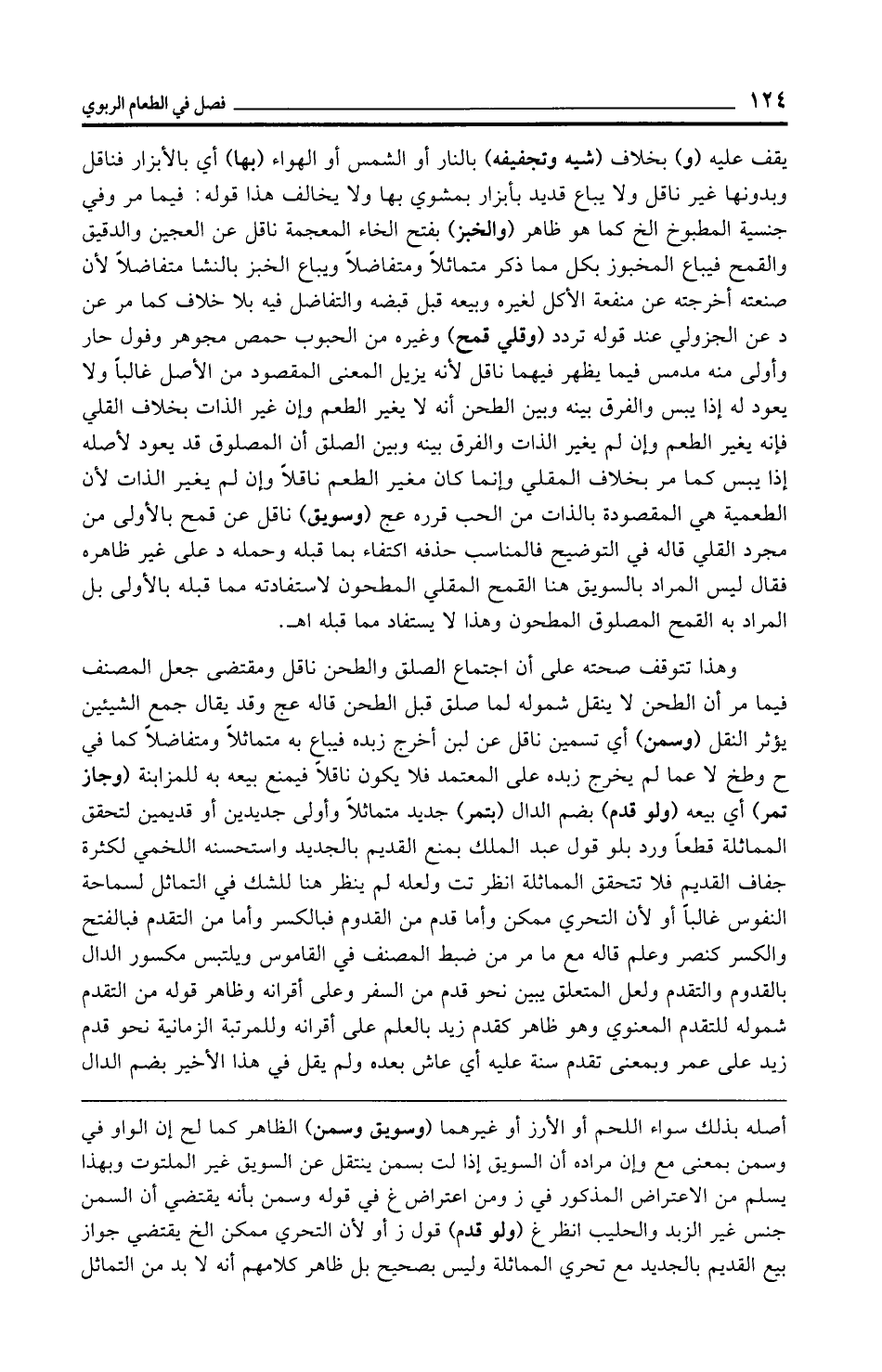 وهذا تتوقف صحته على أن اجتماع الصلق والطحن ناقل ومقتضى جعل المصنف فيما مر أن الطحن لا ينقل شموله لما صلق قبل الطحن قاله عج وقد يقال جمع الشيئين يؤثر النقل (وسمن) أي تسمين ناقل عن لبن أخرج زبده فيباع به متماثلًا ومتفاضلًا كما في ح وطخ لا عما لم يخرج زبده على المعتمد فلا يكون ناقلًا فيمنع بيعه به للمزابنة (وجاز تمر) أي بيعه (ولو قدم) بضم الدال (بتمر) جديد متماثلًا وأولى جديدين أو قديمين لتحقق المماثلة قطعًا ورد بلو قول عبد الملك بمنع القديم بالجديد واستحسنه اللخمي لكثرة جفاف القديم فلا تتحقق المماثلة انظر تت ولعله لم ينظر هنا للشك في التماثل لسماحة النفوس غالبًا أو لأن التحري ممكن وأما قدم من القدوم فبالكسر وأما من التقدم فبالفتح والكسر كنصر وعلم قاله مع ما مر من ضبط المصنف في القاموس ويلتبس مكسور الدال بالقدوم والتقدم ولعل المتعلق يبين نحو قدم من السفر وعلى أقرانه وظاهر قوله من المتقدم شموله للتقدم المعنوي وهو ظاهر كقدم زيد بالعلم على أقرانه وللمرتبة الزمانية نحو قدم زيد على عمر وبمعنى تقدم سنة عليه أي عاش بعده ولم يقل في هذا الأخير بضم الدال