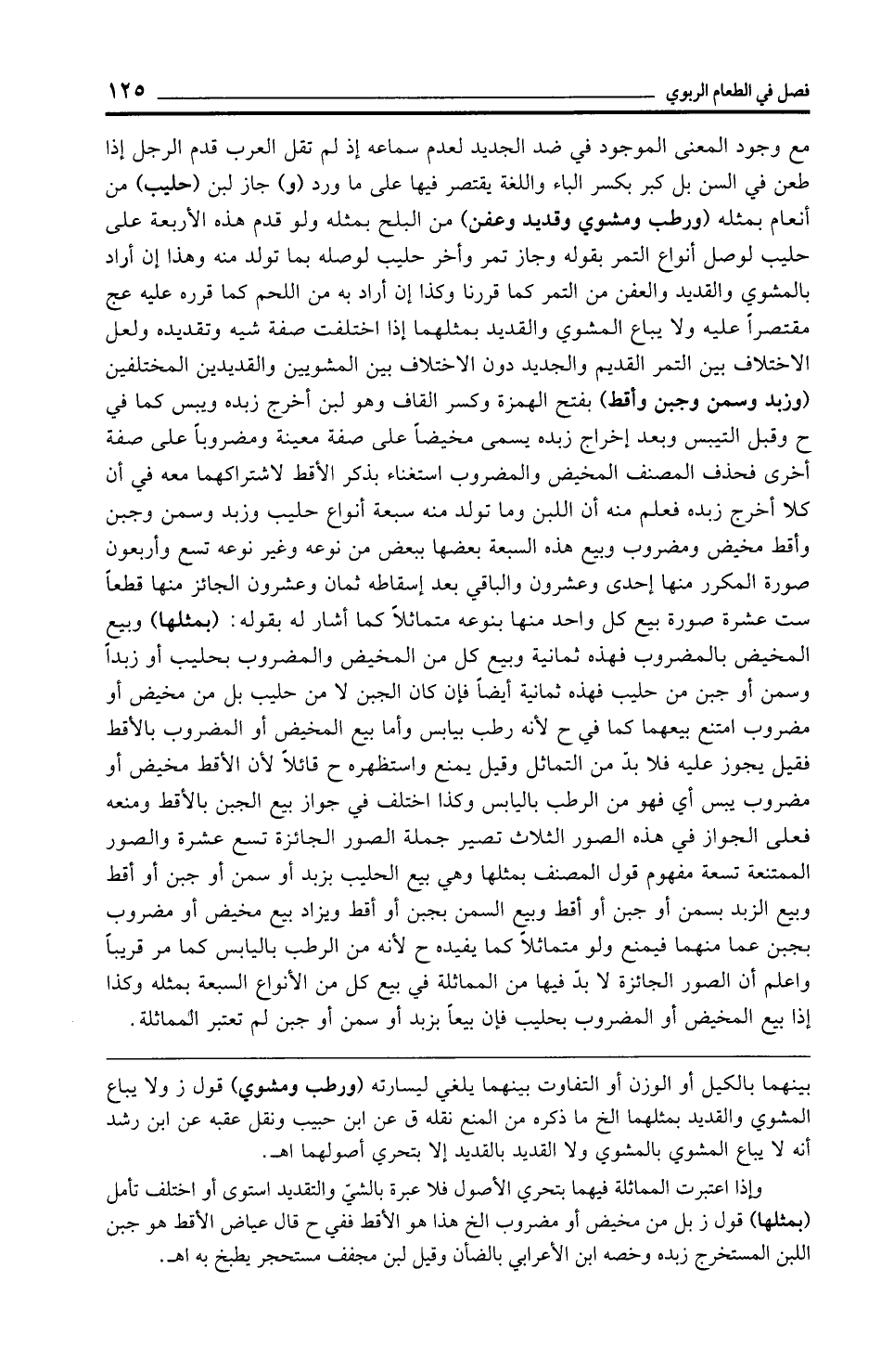 مع وجود المعنى الموجود في ضد الجديد لعدم سماعه إذ لم تقل العرب قدم الرجل إذا طعن في السنن بل كبر بكسر الباء واللغة يقتصر فيها على ما ورد (و) جاز لبن (حليب) من أنعام بمثله (ورطب ومشوي وقديد وعفن) من البلح بمثله ولو قدم هذه الأربعة على حليب لوصل أنواع التمر بقوله وجاز تمر وأخر حليب لوصله بما تولد منه وهذا إن أراد بالمشوي والقديد والعفن من التمر كما قررنا وكذا إن أراد به من اللحم كما قرره عليه عج مقتصرًا عليه ولا يباع المشوي والقديد بمثلهما إذا اختلفت صفة شيه وتقديده ولعل الاختلاف بين التمر القديم والجديد دون الاختلاف بين المشويين والقديدين المختلفين (وزبد وسمن وجبن وأقط) بفتح الهمزة وكسر القاف وهو لبن أخرج زبده ويبس كما في ح وقبل التيبس وبعد إخراج زبده يسمى مخيضًا على صفة معينة ومضروبًا على صفة أخرى فحذف المصنف المخيض والمضروب استغناء بذكر الأقط لاشتراكهما معه في أن كلا أخرج زبده فعلم منه أن اللبن وما تولد منه سبعة أنواع حليب وزبد وسمن وجبن وأقط مخيض ومضروب وبيع هذه السبعة بعضها ببعض من نوعه وغير نوعه تسع وأربعون صورة المكرر منها إحدى وعشرون والباقي بعد إسقاطه ثمان وعشرون الجائز منها قطعًا ست عشرة صورة بيع كل واحد منها بنوعه متماثلًا كما أشار له بقوله: (بمثلها) وبيع المخيض بالمضروب فهذه ثمانية وبيع كل من المخيض والمضروب بحليب أو زبدًا وسمن أو جبن من حليب فهذه ثمانية أيضًا فإن كان الجبن لا من حليب بل من مخيض أو مضروب امتنع بيعهما كما في ح لأنه رطب بيابس وأما بيع المخيض أو المضروب بالأقط فقيل يجوز عليه فلا بد من التماثل وقيل يمنع واستظهره ح قائلًا لأن الأقط مخيض أو مضروب يبس أي فهو من الرطب باليابس وكذا اختلف في جواز بيع الجبن بالأقط ومنعه فعلى الجواز في هذه الصور الثلاث تصير جملة الصور الجائزة تسع عشرة والصور الممتنعة تسعة مفهوم قول المصنف بمثلها وهي بيع الحليب بزبد أو سمن أو جبن أو أقط وبيع الزبد بسمن أو جبن أو أقط وبيع السمن بجبن أو أقط ويزاد بيع مخيض أو مضروب بجبن عما منهما فيمنع ولو متمائلًا كما يفيده ح لأنه من الرطب باليابس كما مر قريبًا واعلم أن الصور الجائزة لا بد فيها من المماثلة في بيع كل من الأنواع السبعة بمثله وكذا إذا بيع المخيض أو المضروب بحليب فإن بيعًا بزبد أو سمن أو جبن لم تعتبر المماثلة.