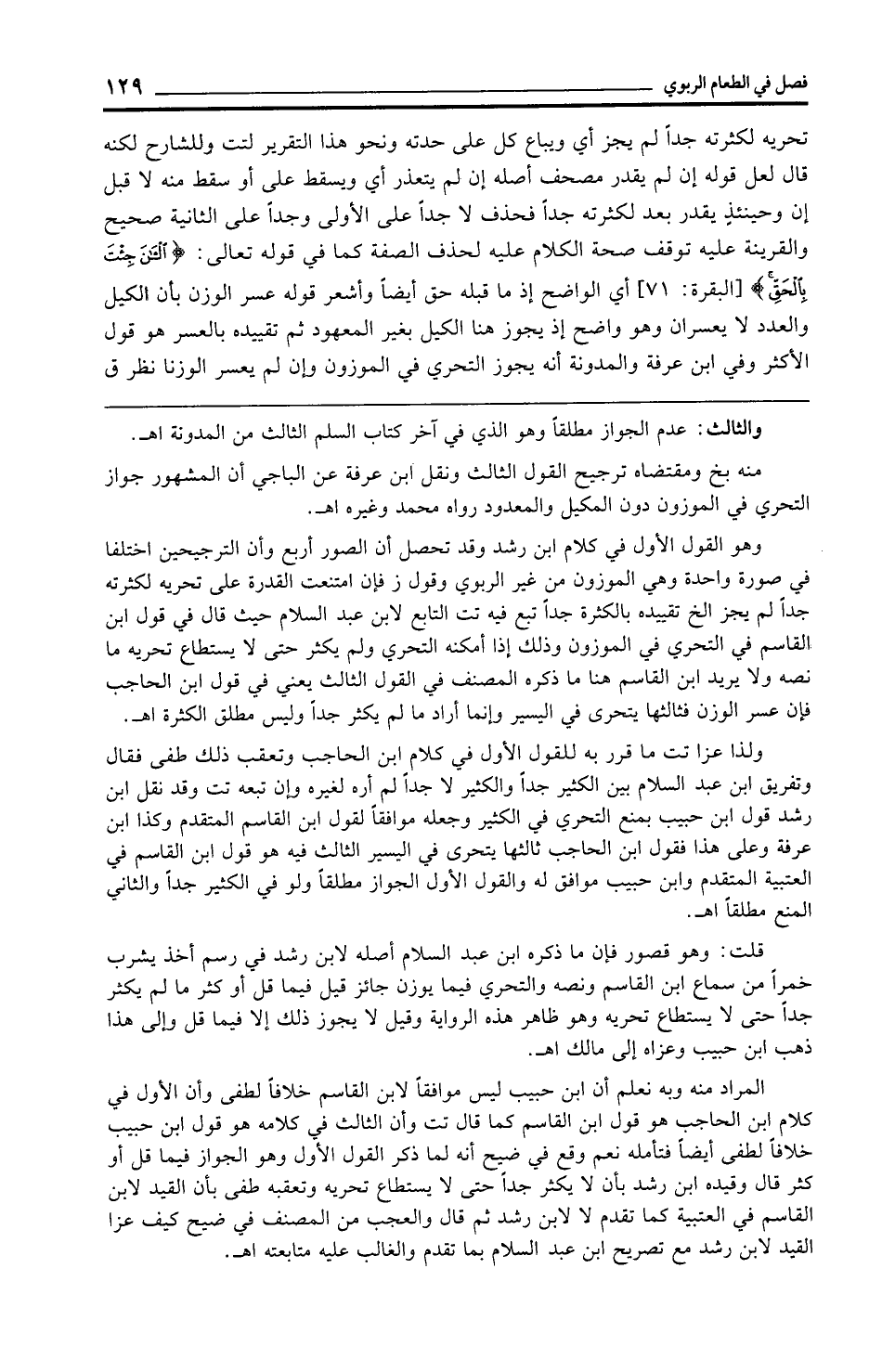 قلت: وهو قصور فإن ما ذكره ابن عبد السلام أصله لابن رشد في رسم أخذ يشرب خمرًا من سماع ابن القاسم ونصه والتحري فيما يوزن جائز قيل فيما قل أو كثر ما لم يكثر جدًّا حتى لا يستطاع تحريه وهو ظاهر هذه الرواية وقيل لا يجوز ذلك إلا فيما قل وإلى هذا ذهب ابن حبيب وعزاه إلى مالك اهـ.