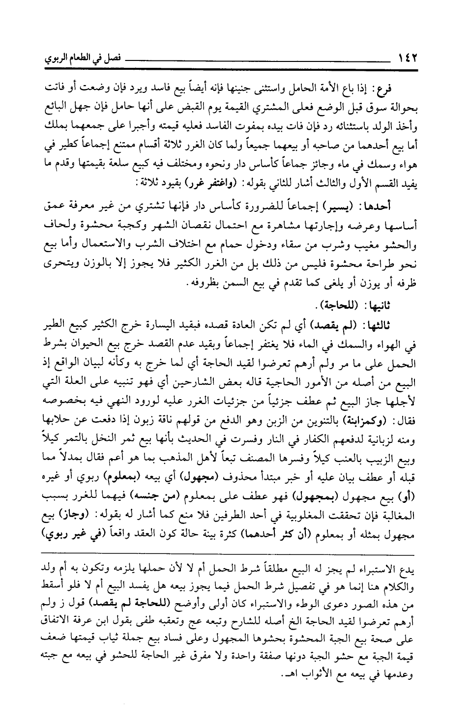 فرع: إذا باع الأمة الحامل واستثنى جنينها فإنه أيضًا بيع فاسد ويرد فإن وضعت أو فاتت بحوالة سوق قبل الوضع فعلى المشتري القيمة يوم القبض على أنها حامل فإن جهل البائع وأخذ الولد باستثنائه رد فإن فات بيده بمفوت الفاسد فعليه قيمته وأجبرا على جمعهما بملك أما بيع أحدهما من صاحبه أو بيعهما جميعًا ولما كان الغرر ثلاثة أقسام ممتنع إجماعًا كطير في هواء وسمك في ماء وجائز جماعًا كأساس دار ونحوه ومختلف فيه كبيع سلعة بقيمتها وقدم ما يفيد القسم الأول والثالث أشار للثاني بقوله: (واغتفر غرر) بقيود ثلاثة: