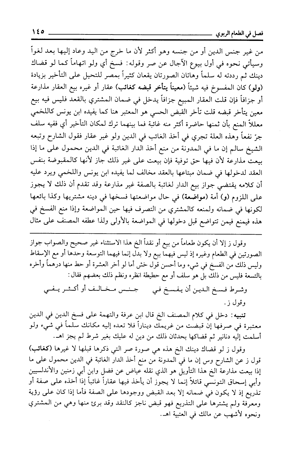 تنبيه: دخل في كلام المصنف الخ قال ابن عرفة والتهمة على فسخ الدين في الدين معتبرة في صرفها إن قبضت من غريمك دينارًا فلا تعده إليه مكانك سلمًا في شيء ولو أسلمت إليه دنانير ثم قضاكها بحدثان ذلك من دين له عليك بغير شرط لم يجز اهـ.