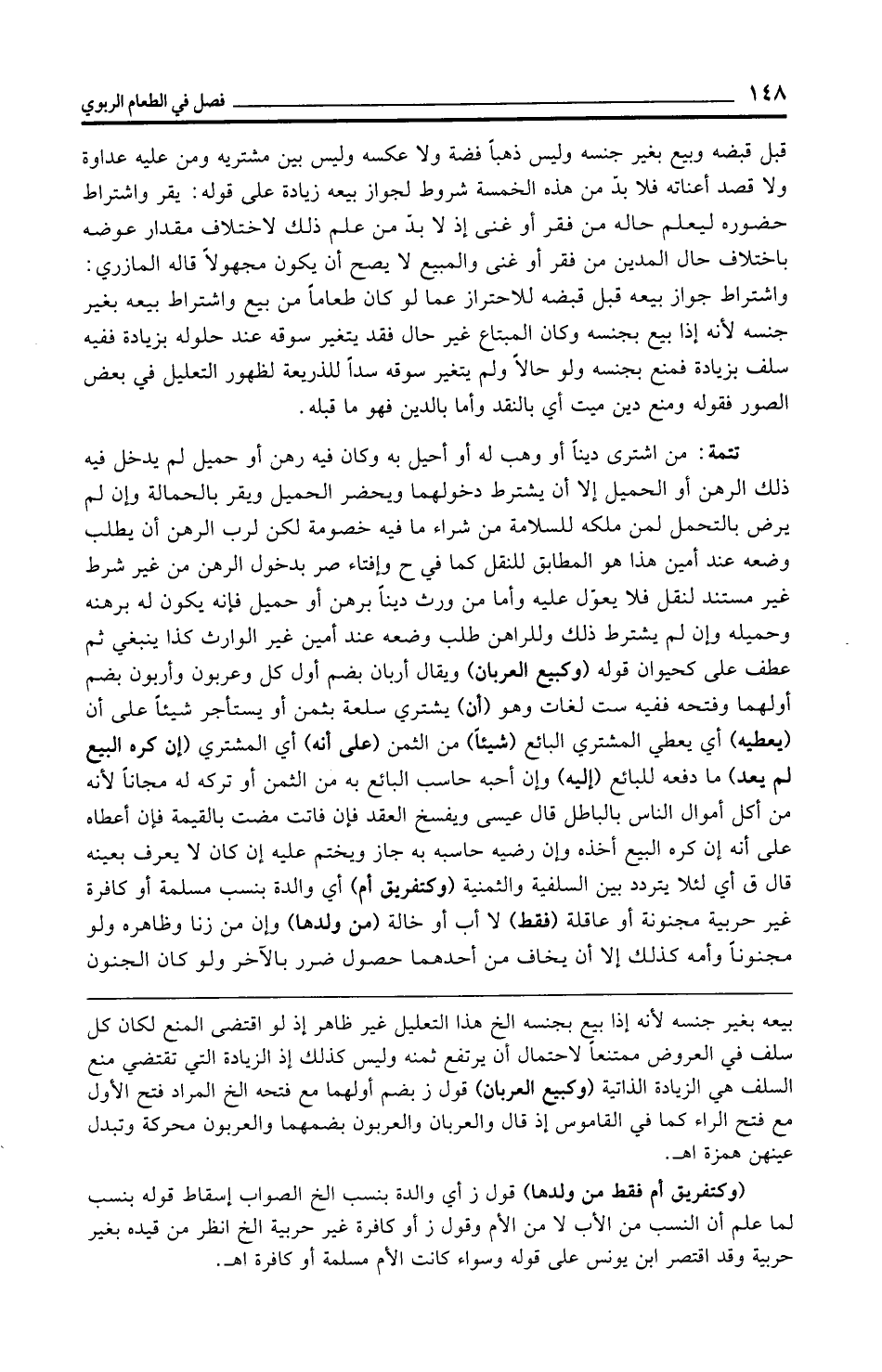 تتمة: من اشترى دينًا أو وهب له أو أحيل به وكان فيه رهن أو حميل لم يدخل فيه ذلك الرهن أو الحميل إلا أن يشترط دخولهما ويحضر الحميل ويقر بالحمالة وإن لم يرض بالتحمل لمن ملكه للسلامة من شراء ما فيه خصومة لكن لرب الرهن أن يطلب وضعه عند أمين هذا هو المطابق للنقل كما في ح وإفتاء صر بدخول الرهن من غير شرط غير مستند لنقل فلا يعول عليه وأما من ورث دينًا برهن أو حميل فإنه يكون له برهنه وحميله وإن لم يشترط ذلك وللراهن طلب وضعه عند أمين غير الوارث كذا ينبغي ثم عطف على كحيوان قوله (وكبيع العربان) ويقال أربان بضم أول كل وعربون وأربون بضم أولهما وفتحه ففيه ست لغات وهو (أن) يشتري سلعة بثمن أو يستأجر شيئًا على أن (يعطيه) أي يعطي المشتري البائع (شيئًا) من الثمن (على أنه) أي المشتري (إن كره البيع لم يعد) ما دفعه للبائع (إليه) وإن أحبه حاسب البائع به من الثمن أو تركه له مجانًا لأنه من أكل أموال الناس بالباطل قال عيسى ويفسخ العقد فإن فاتت مضت بالقيمة فإن أعطاه على أنه إن كره البيع أخذه وإن رضيه حاسبه به جاز ويختم عليه إن كان لا يعرف بعينه قال ق أي لئلا يتردد بين السلفية والثمنية (وكتفريق أم) أي والدة بنسب مسلمة أو كافرة غير حربية مجنونة أو عاقلة (فقط) لا أب أو خالة (من ولدها) وإن من زنا وظاهره ولو مجنونًا وأمه كذلك إلا أن يخاف من أحدهما حصول ضرر بالآخر ولو كان الجنون