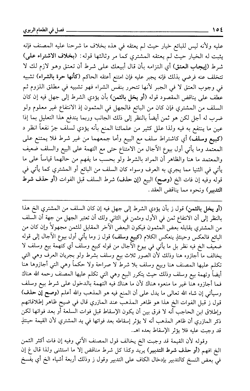 (أو يخل بالثمن) قول ز بأن يؤدي الشرط إلى جهل فيه إن كان السلف من المشتري الخ هذا بالنظر إلى أن الانتفاع ثمن في الأول ومثمن في الثاني ولك أن تعتبر الجهل من جهة أن السلف من المشتري يقابله بعض المثمون فيكون البعض الآخر المقابل للثمن مجهولًا وإن كان من البائع فالعكس وحينئذٍ ينعكس الكلام (كبيع وسلف) قول ز وما يأتي أول بيوع الآجال إلى قوله ضعيف الخ فيه نظر بل ما يأتي في بيوع الآجال من قوله كبيع وسلف أي كتهمة بيع وسلف لا يخالف ما أجازوه هنا وذلك لأن الصور ثلاث بيع وسلف بشرط ولو بجريان العرف وهي التي تكلم عليها المصنف هنا وبيع وسلف بلا شرط لا صراحة ولا حكمًا وهي التي أجازوها هنا أيضًا وتهمة بيع وسلف وذلك حيث يتكرر البيع وهي التي تكلم عليها المصنف رحمه الله هناك فما أجازوه هنا غير ما منعوه هناك لأن ما هناك فيه التهمة بالدخول على شرط بيع وسلف وسيأتي إن شاء الله تعالى ما يدل على أن المنع فيه هو المذهب والله أعلم (وصح إن حذف) قول ز قبل الفوات الخ هذا هو ظاهر المذهب عند المازري قال في ضيح ظاهر إطلاقاتهم وإطلاق ابن الحاجب أنه لا فرق بين أن يكون الإسقاط قبل فوات السلعة أو بعد فواتها لكن ذكر المازري أن ظاهر المذهب أنه لا يؤثر إسقاطه بعد فواتها في يد المشتري لأن القيمة حينئذٍ قد وجبت عليه فلا يؤثر الإسقاط بعده اهـ.